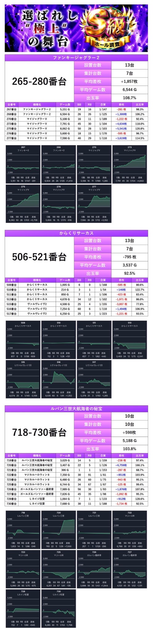 265番台~280番台、506番台~521番台、718番台~730番台までの合計3箇所をピックアップ。機種跨ぎであっても優秀台の隣は狙えるというのが今回で分かったので店の傾向として覚えておくと良さそうだ。