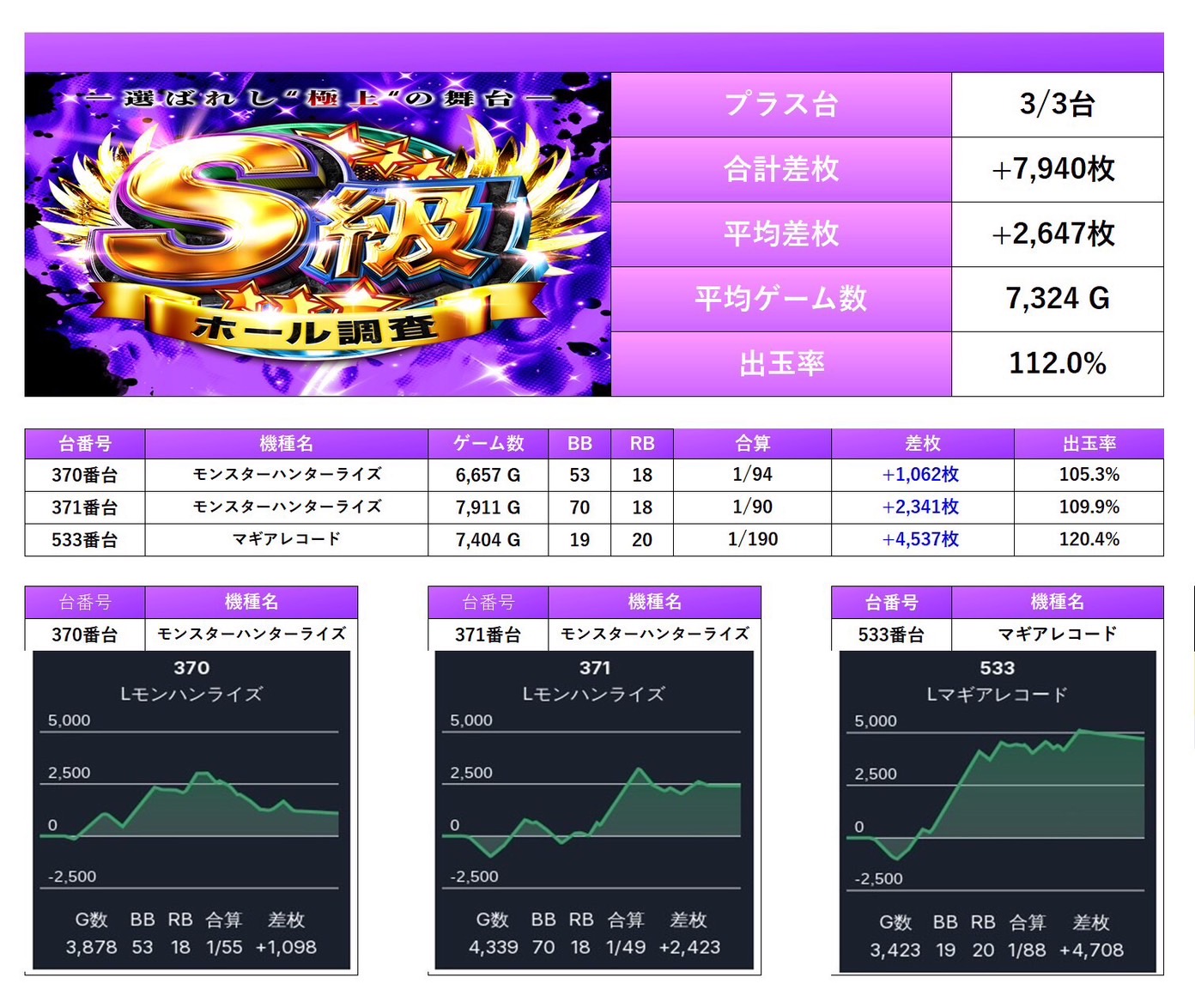 平均差枚は+2,647枚、平均出率112.0%と人気のスマスロが対象になっていて出率も安定しプラス域を確保。