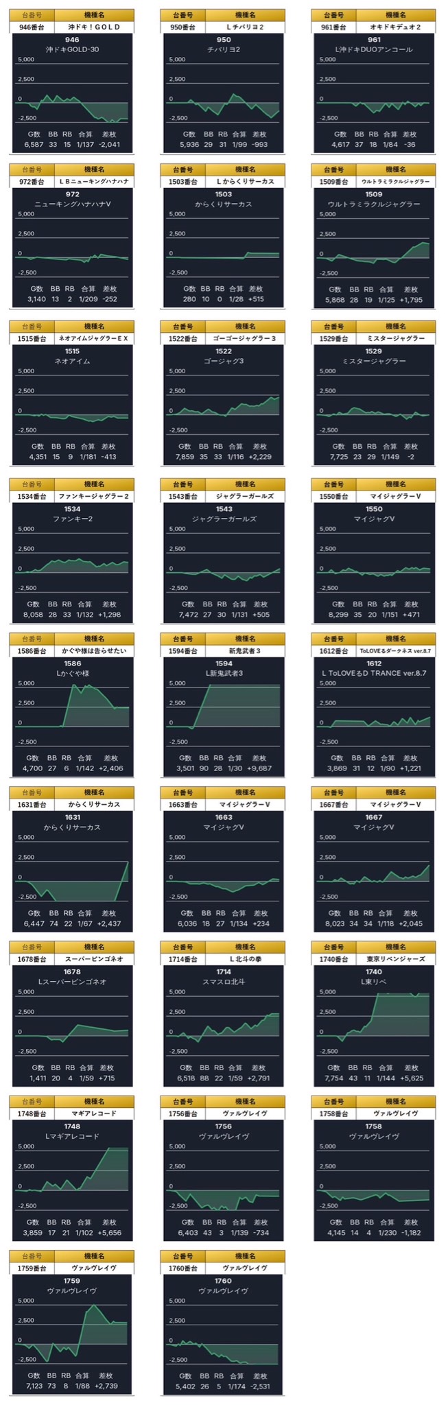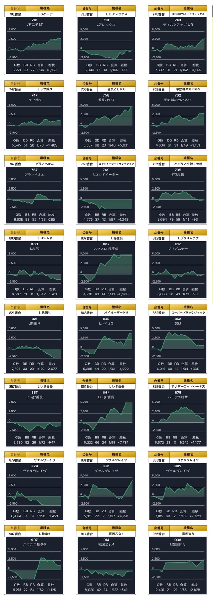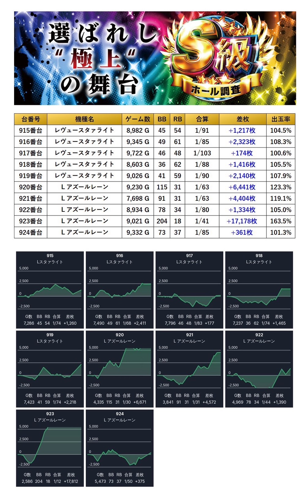 平均差枚は+3,699枚で平均出率が113.7%と機種跨ぎで10台もの多台数が並びになっていた。対象になった全台がプラスと視覚的にも素晴らしい仕掛けだった。
