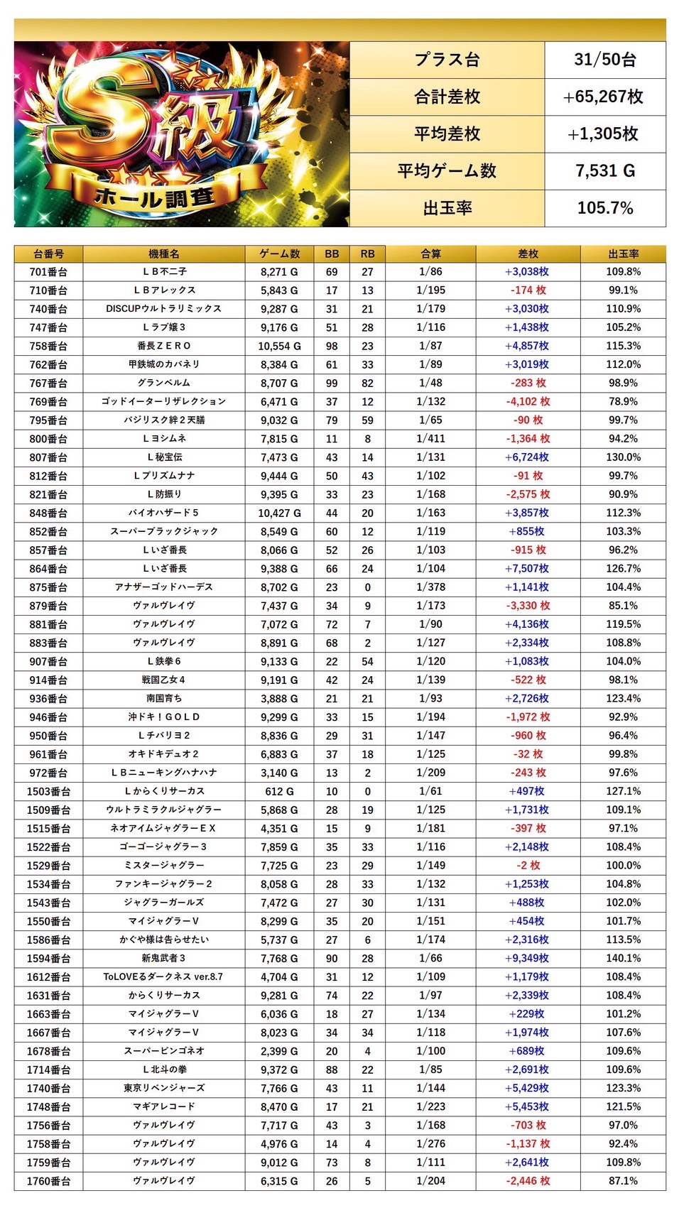 平均差枚は+1,305枚で平均出率が105.7%と多彩な機種が各種ホールの出率を押し上げる要因となっていた。