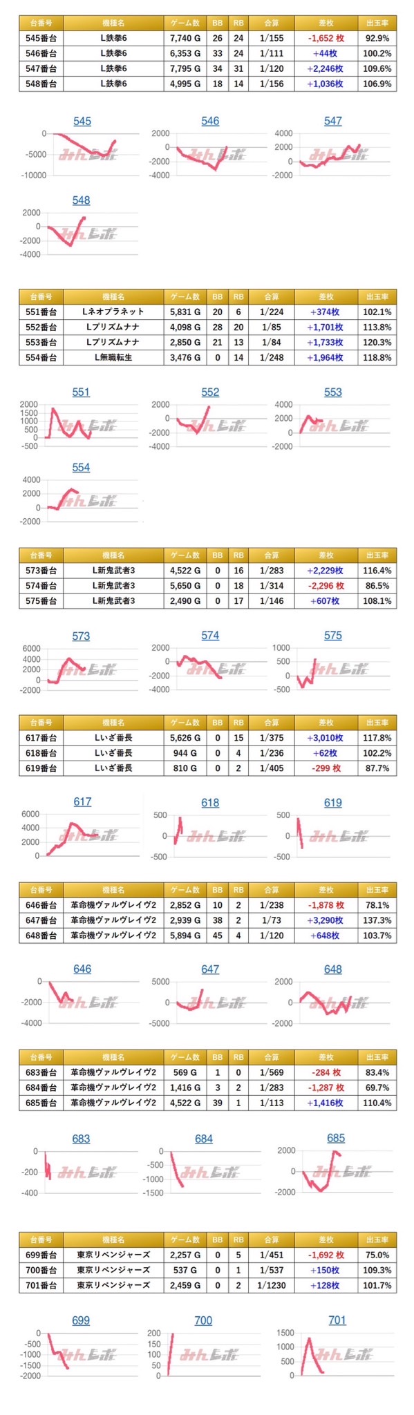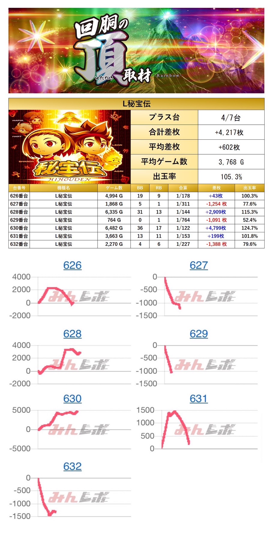 「L秘宝伝」の1機種をpick up。1機種7台の平均差枚は+602枚、平均出率105.3%となった。