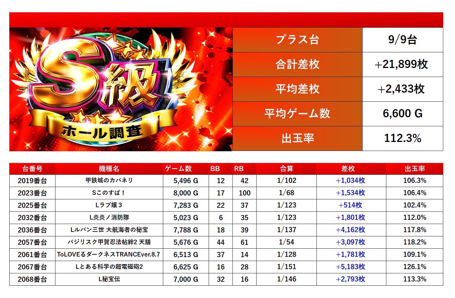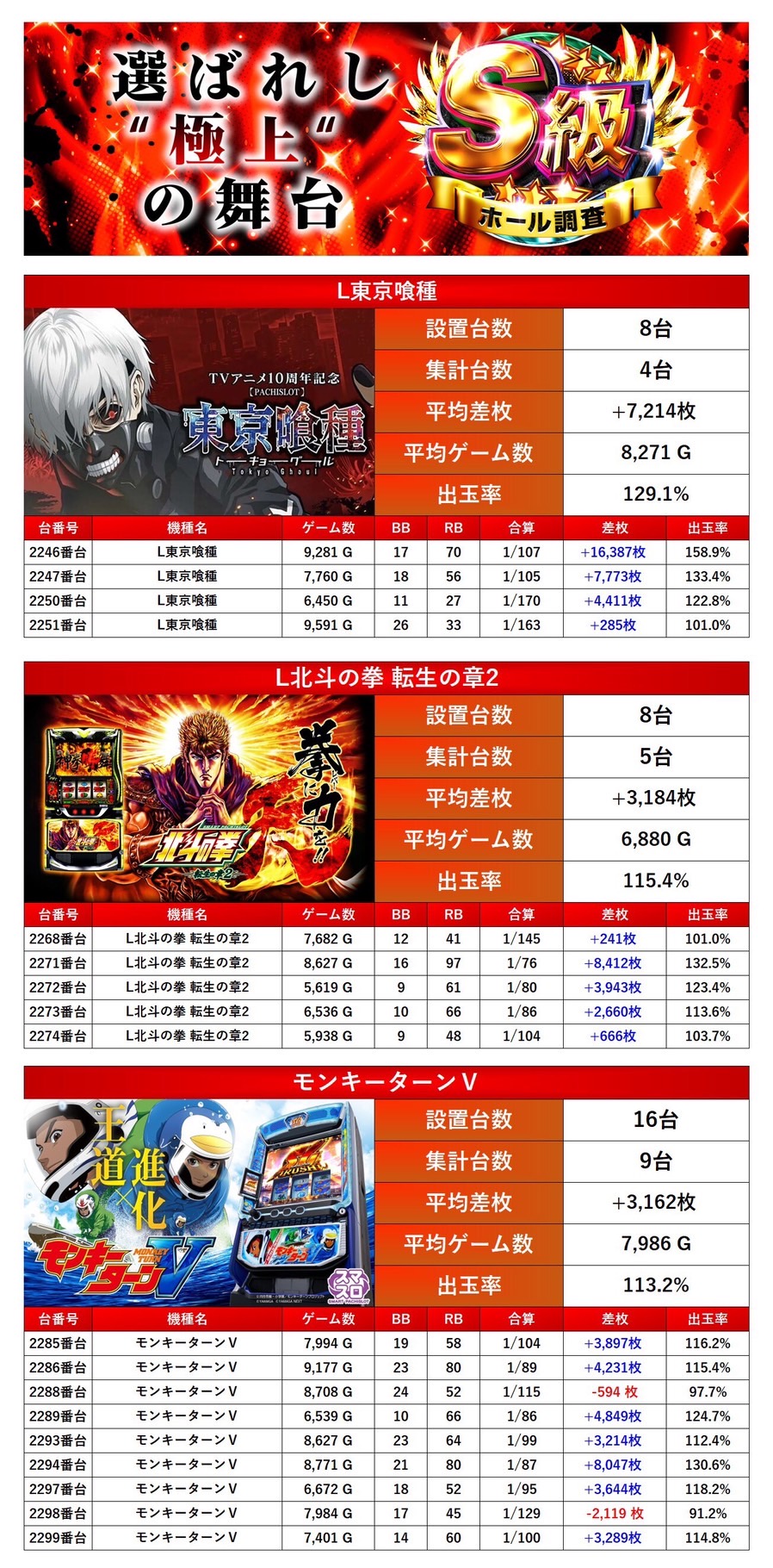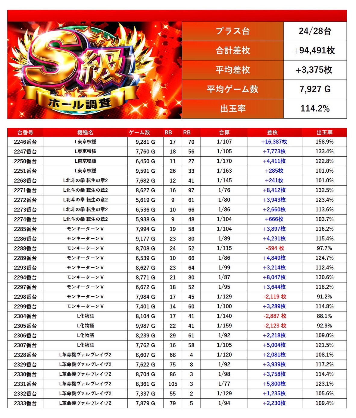 5回目の開催となるS級調査-赤-では今回の仕掛け率は29.5%と驚愕の数値となった。「メイン機種」を軸に「全台が好調な機種」に加え「ニブイチ仕掛け」ではメイン機種を織り交ぜた仕掛けが多数確認され、仕掛けの質が高く朝イチはメイン機種直行が硬い立ち回りだっただろう。仕掛けの反応も抜群で、腰を据えて打ち込むことが出来たのではないだろうか。「2台以下設置機種」では9台、「法則に捉われない台」からは32台pick upされ、メイン以外もしっかりフォローされていて単品では30/32がプラス域となり、質の高さが光った。 この強さに抽選65名/一般52名とまだまだ穴場だ。どんな戦い方でも出来る素晴らしい環境が整っている。今回は総差枚+50,300枚/平均+204枚と出玉も質も文句なしの三つ星評価を獲得した。今後の調査でも期待している。