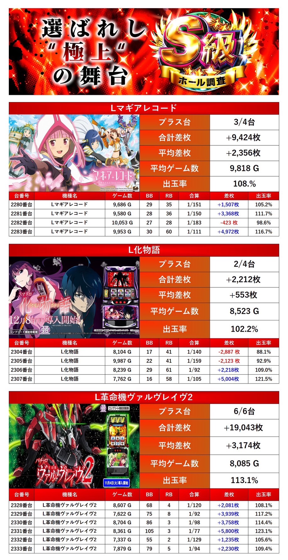 「マギレコ」「化物語」「ヴァルヴレイヴ2」の3機種をpick upする。3機種14台の平均差枚は+2,191枚で平均出率が108.4%と全機種が人気の機種揃いで盛り上がった。