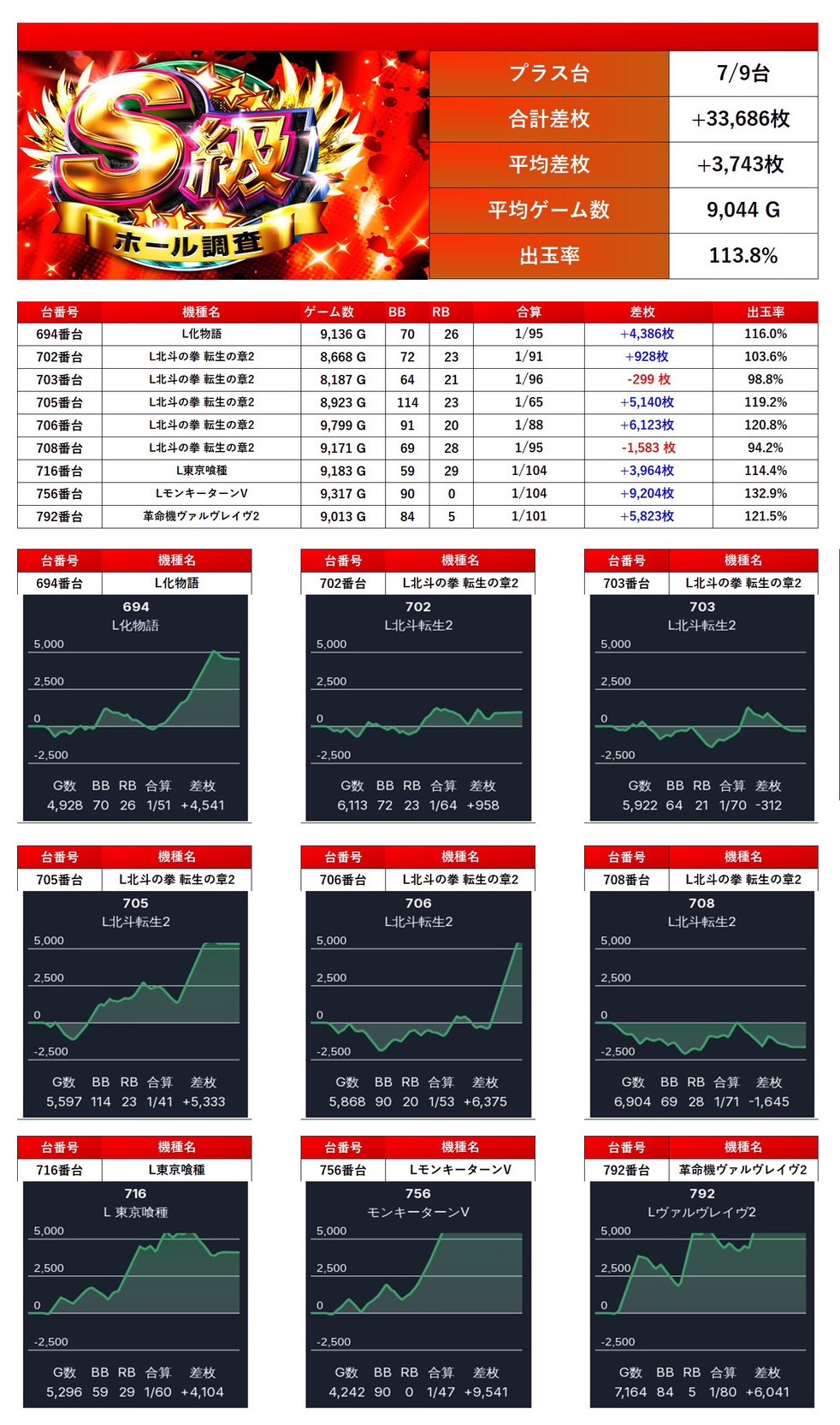 「化物語」「東京喰種」「ヴヴヴ2」「北斗の拳転生の章2」「モンキー」から最優秀台を9台pick upする。平均差枚は+3,743枚で平均出率が113.8%とメイン機種らしい盛り上がりを見せた。