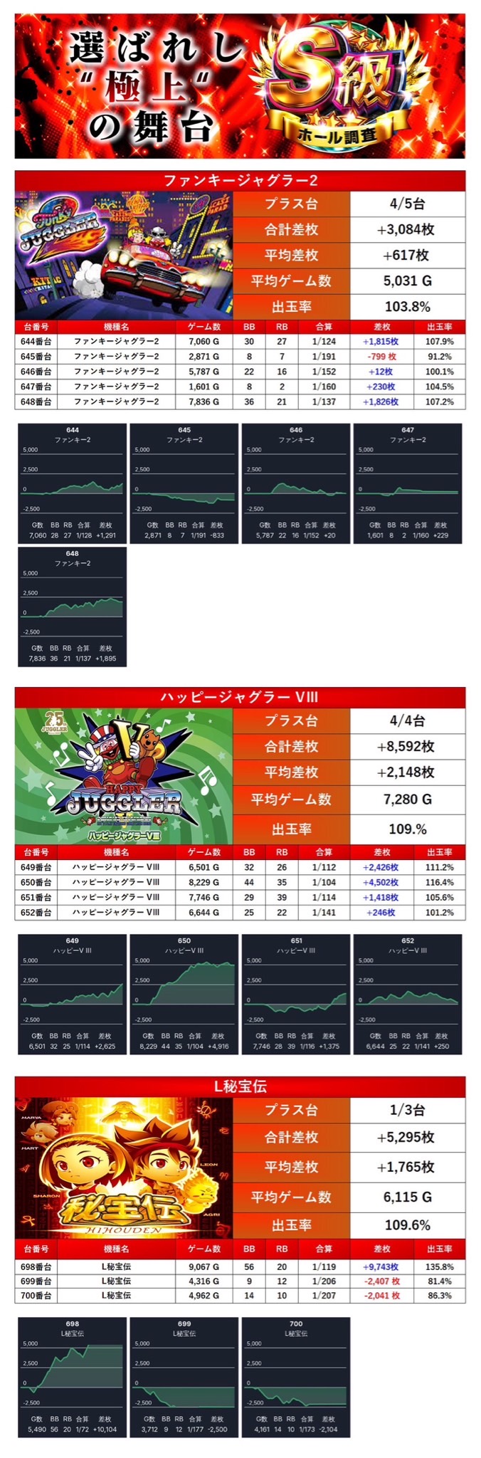 「ファンキージャグラー」「ハッピージャグラー」「L秘宝伝」の3機種をpick upする。3機種12台の平均差枚は+1,414枚で平均出率が107.3%と安定した出率を確保。