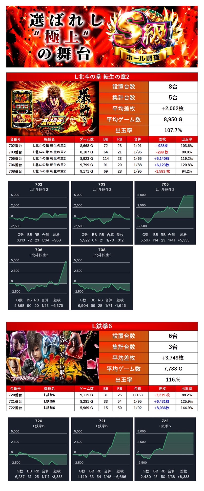 2機種8台の平均差枚は+2,695枚で平均出率が110.5%と局所的に爆発力のある出玉も見られ、ホールの出率を底上げしていた。