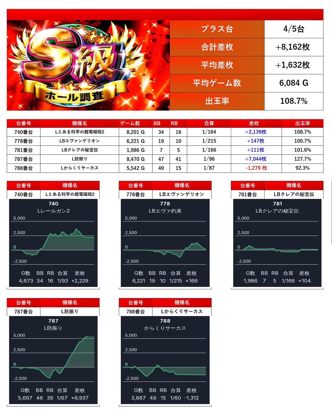メダル機、スマスロから5台をpick up。5台の平均差枚は+1,632枚で平均出率が108.7%多彩な機種が対象になっていた。