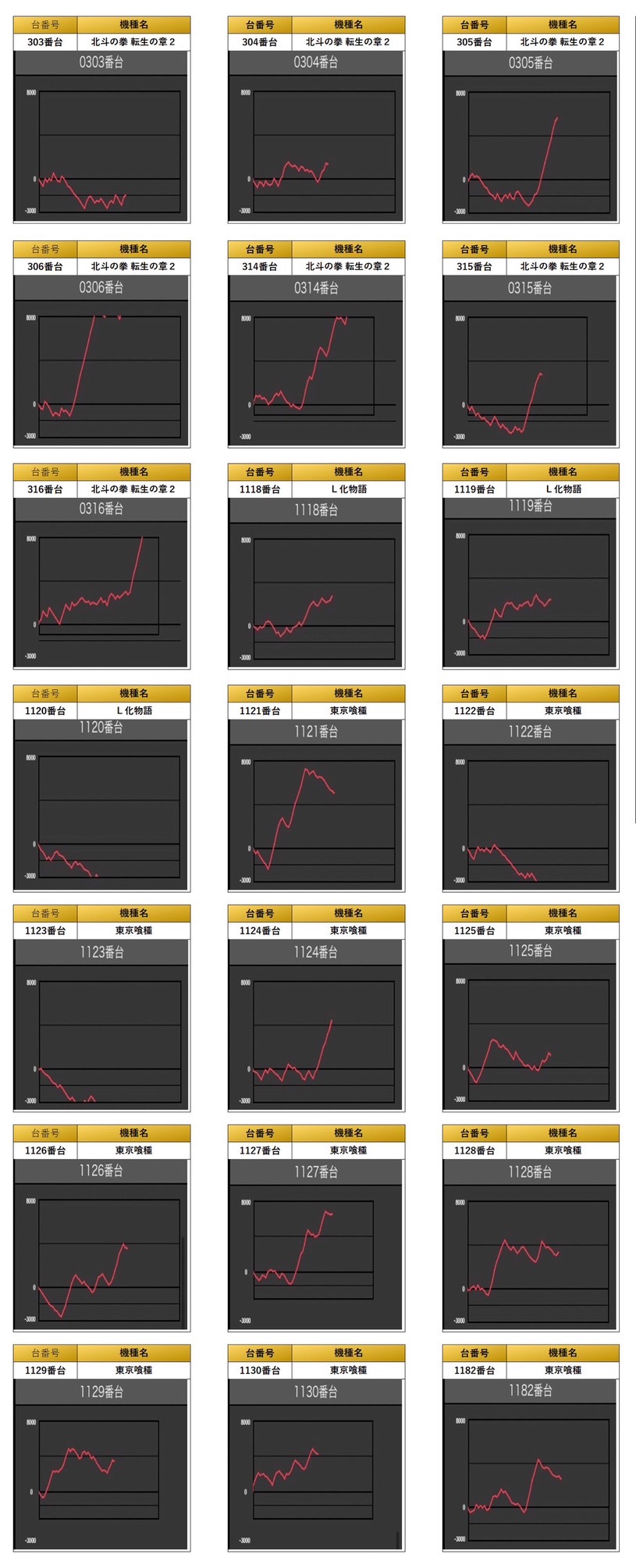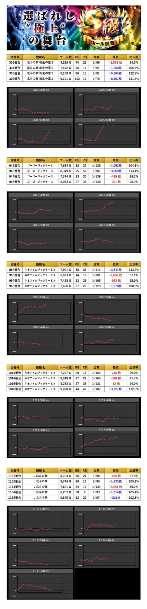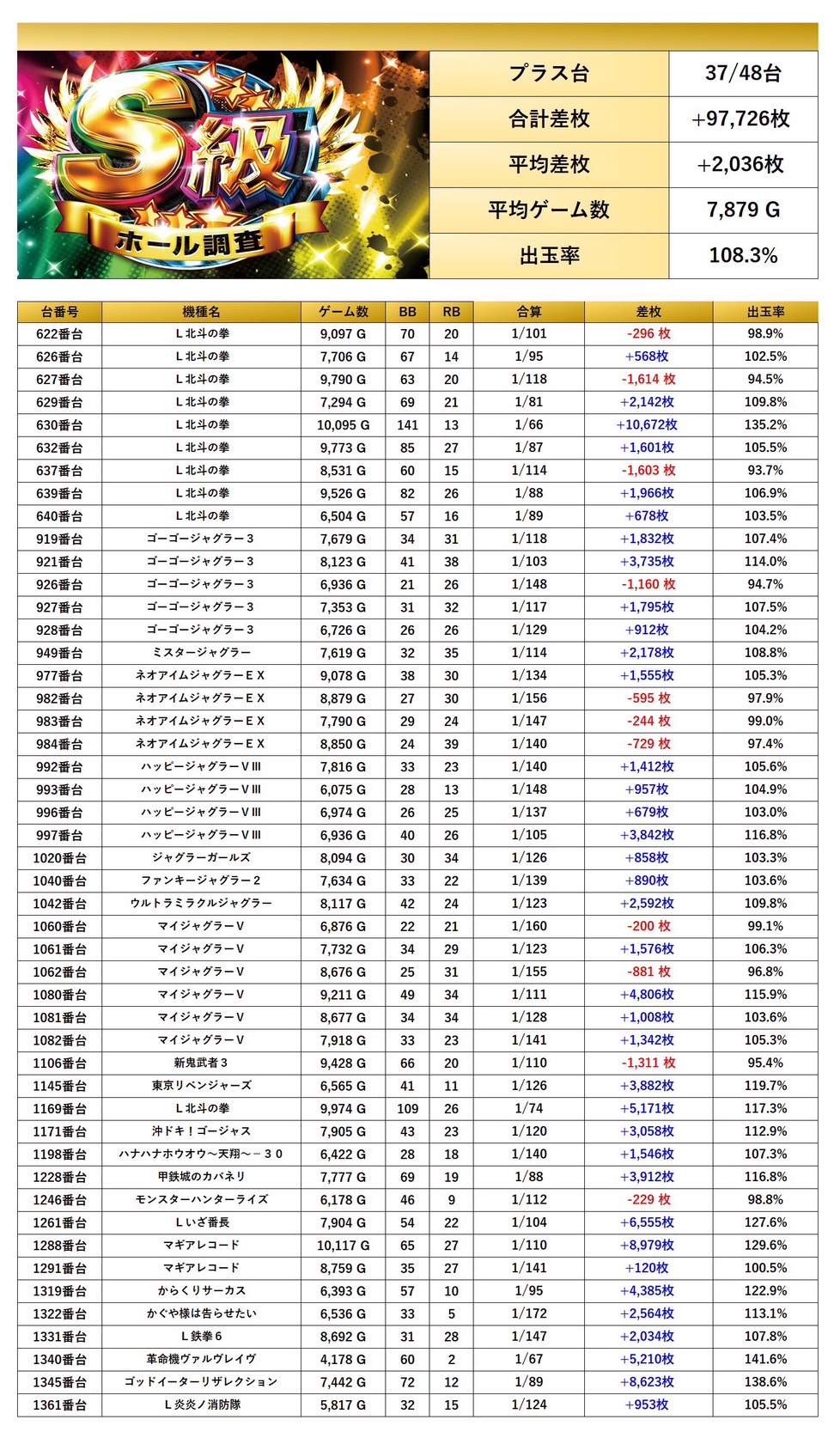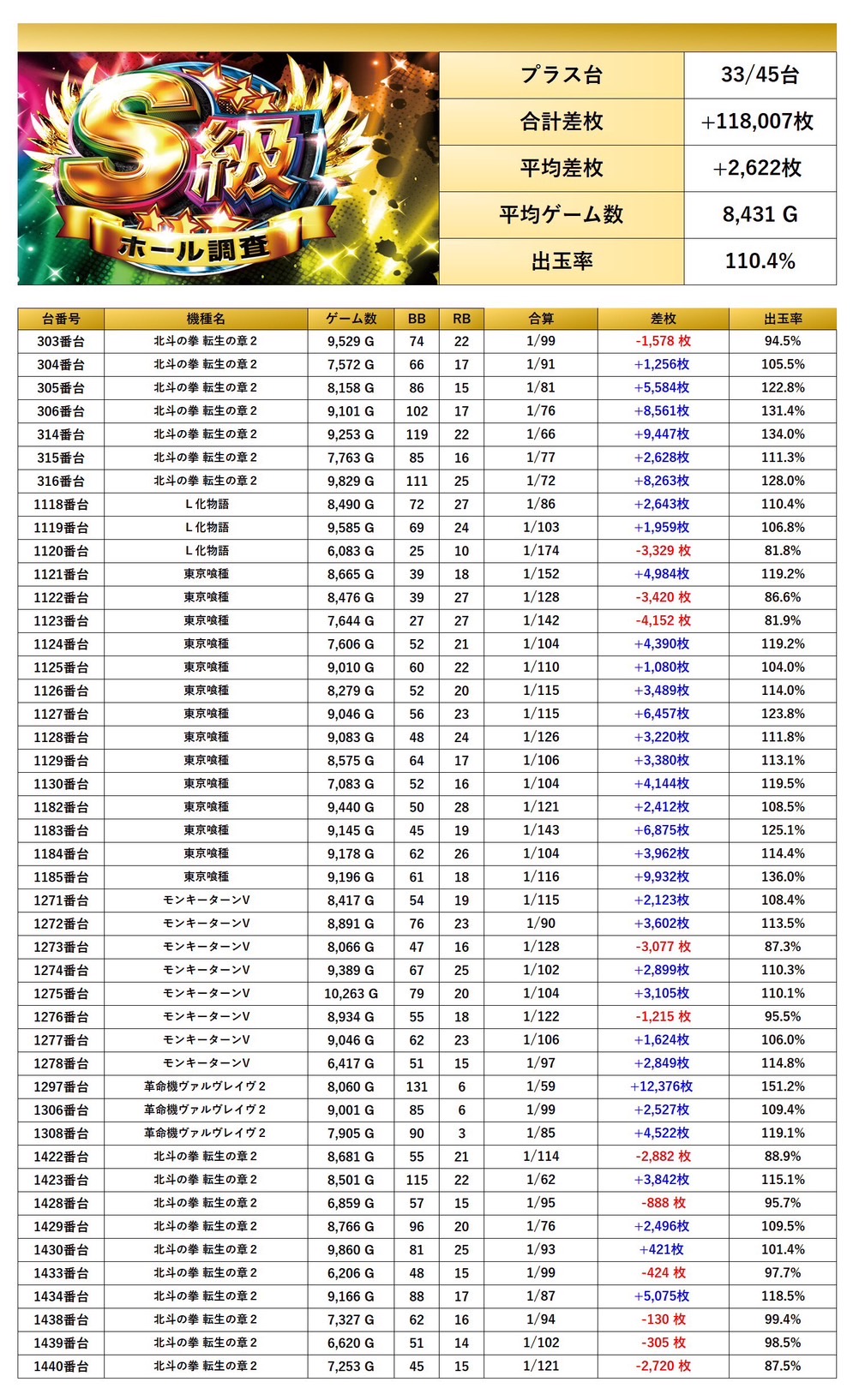 個別にみると「メイン5機種」33/45と半分以上がプラス域と勝率が高かった。「全台が好調な機種」は3機種pick upされた。出率も素晴らしく、腰を据えて打てる状況だったと言える。「設置の半分が好調な機種」は4機種27台とメイン3機種を織り交ぜた仕掛けで多台数がpick upされた。「4台以上並び」が5箇所pick up、北斗シリーズ、ジャグラーシリーズから仕掛けられていた。「4台以上機種」が48台pick upと随所で多彩な機種がバランスよく仕掛けられた。「法則に捉われない台」から4台pick upされ、局所的に際立っていた。今回の総差枚は+44,526枚/平均+82枚と稼働が高いなか、安定感のある出率で素晴らしい結果だったが、あと一歩分岐には届かず二つ星評価となった。次回の調査も期待している。