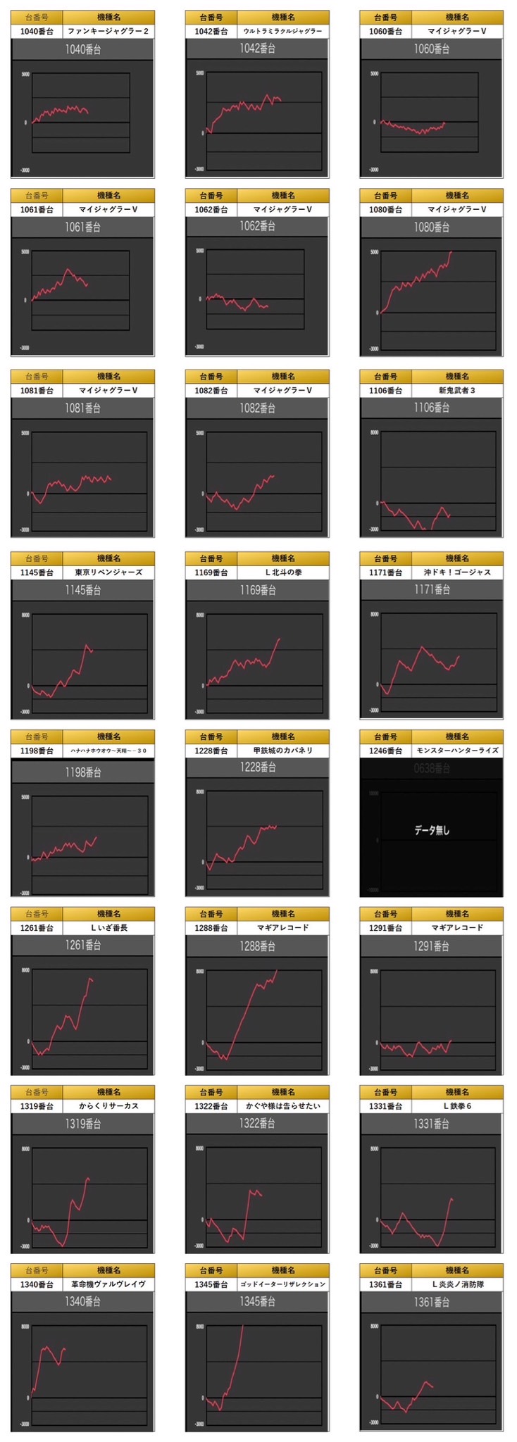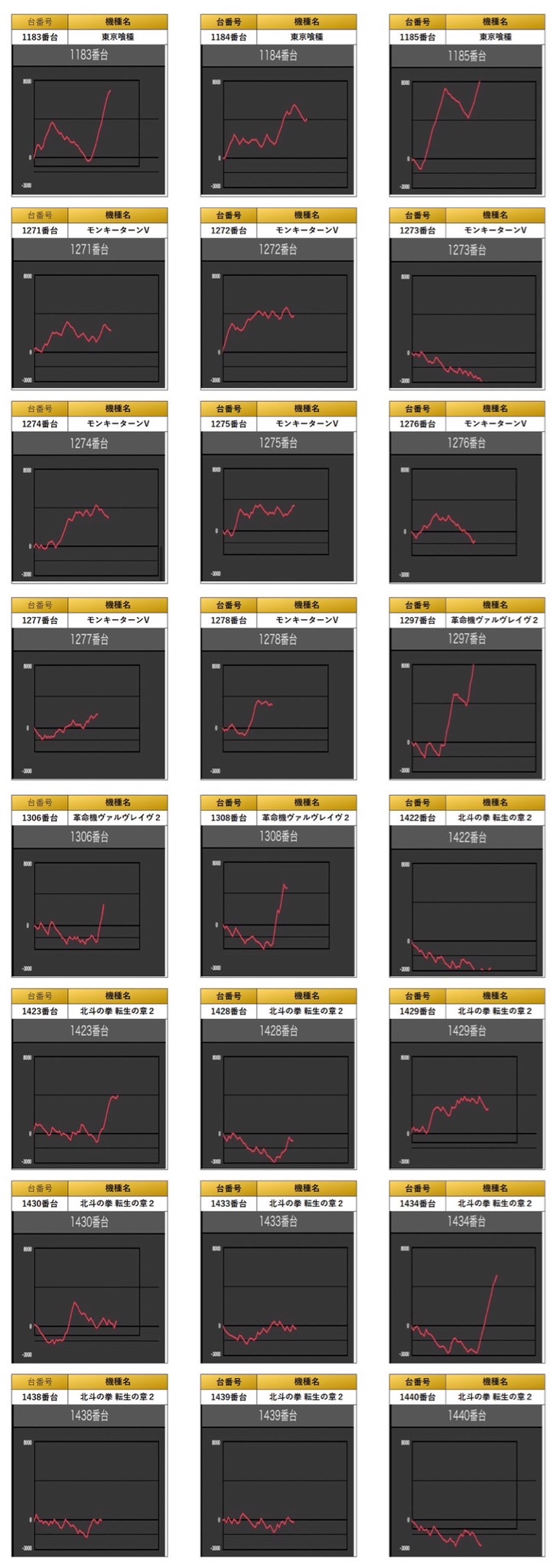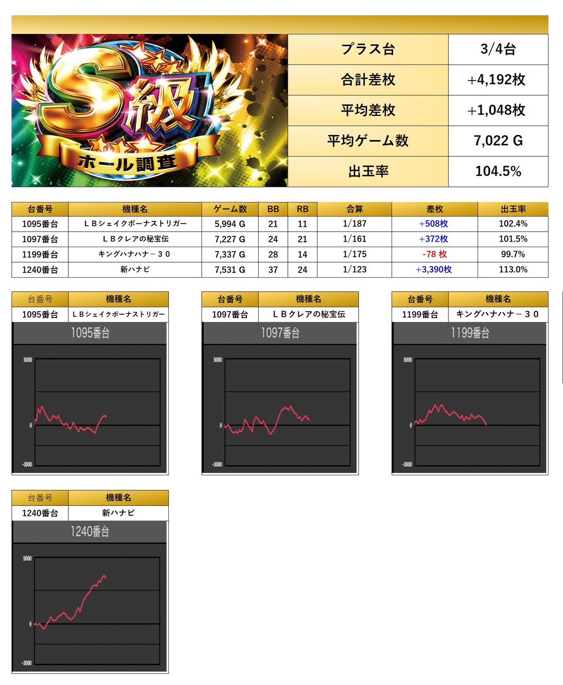 計4台をpick up。平均差枚は+1,048枚、平均出率104.5%。