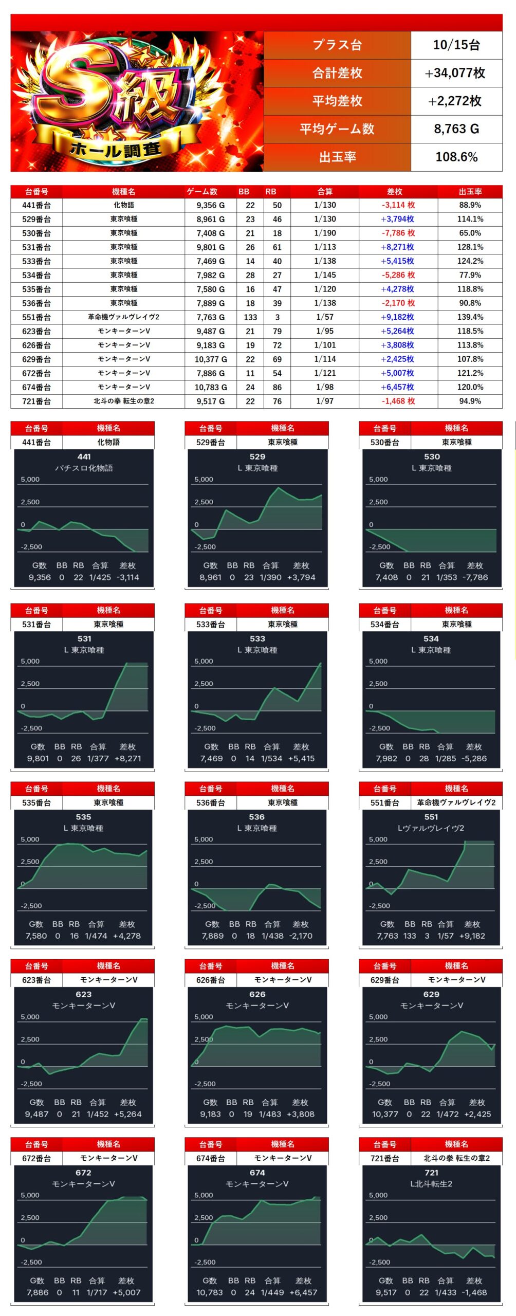メイン優秀台は15台がpick upされ、平均差枚+2,272枚、出率108.6%と安定感のある結果に。