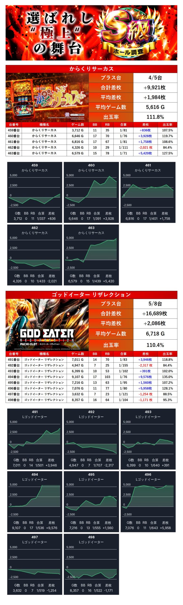 「からくりサーカス」「ゴッドイーター リザレクション」の全台系は、13台で平均差枚+2,047枚、出率110.8%を記録。