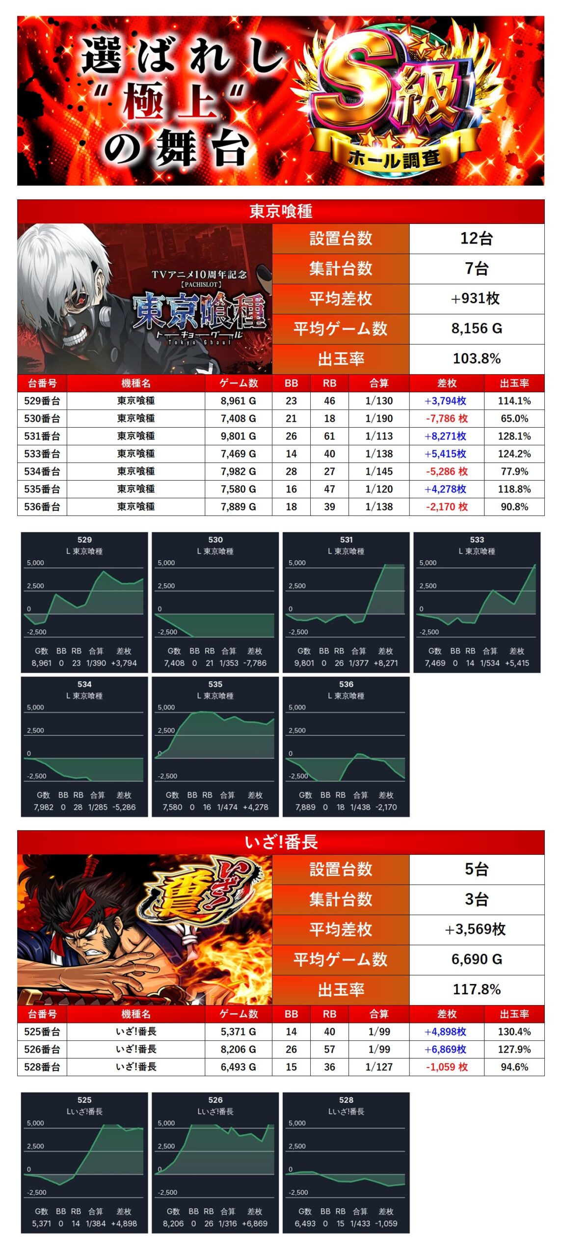 ニブイチ仕掛けとしてpick upされた「東京喰種」「いざ!番長」は、10台で平均差枚+1,722枚、出率107.4%。