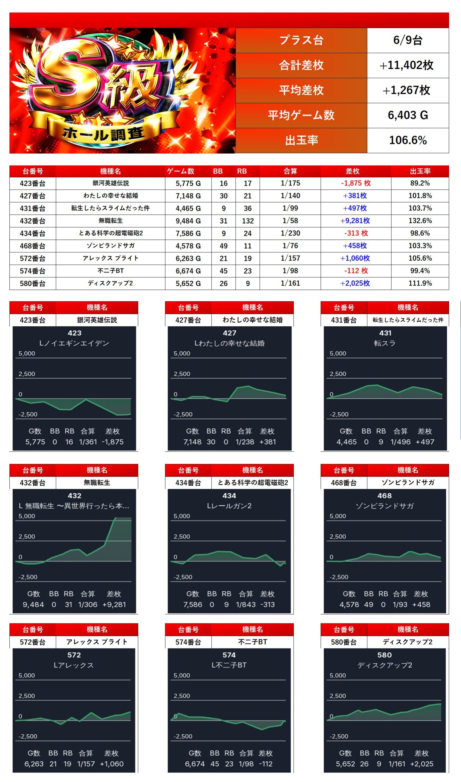 2台以下設置機種からは9台がpick upされ、平均差枚+1,267枚、出率106.6%。
