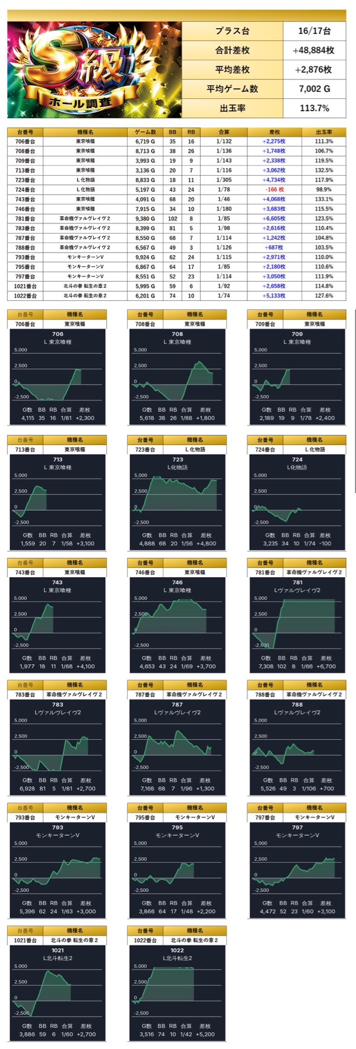 17台の平均差枚は+2,876枚で平均出率が113.7%をマーク。16/17がプラスと勝率も高く、メイン機種らしいポテンシャルを見せた。