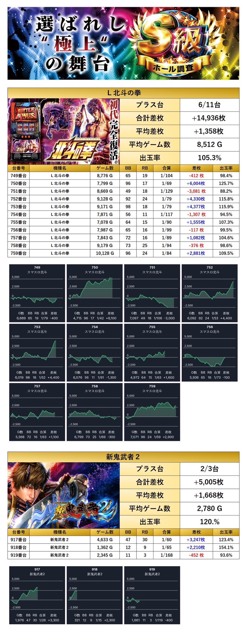5機種11台の平均差枚は+2,817枚で平均出率が113.9%となっていた。対象になった台の出率は圧巻でインパクトを与えた。