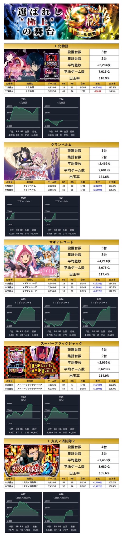 メイン機種でも紹介した「化物語」さらには「グランベルム」「マギレコ」「スーパーブラックジャック」「L炎炎ノ消防隊2」の5機種をpick upする。