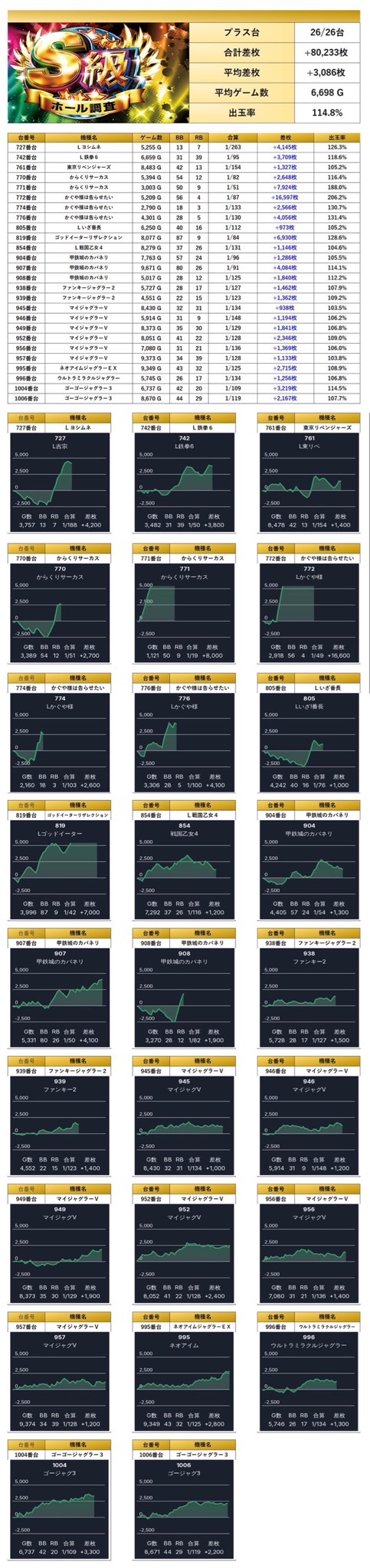 4台以上設置機種から優秀台を探すと26台をpick upすることができた。26台の平均差枚は+3,086枚で平均出率が114.8%と多彩な機種がpick upされた。