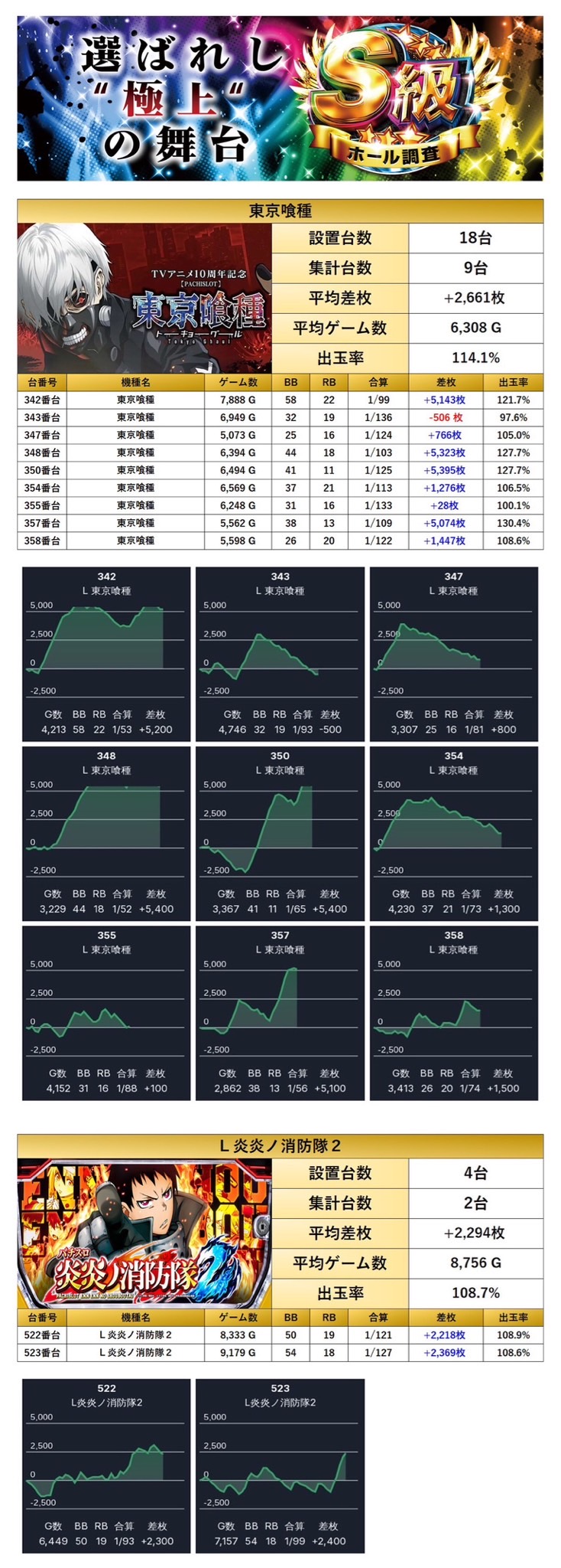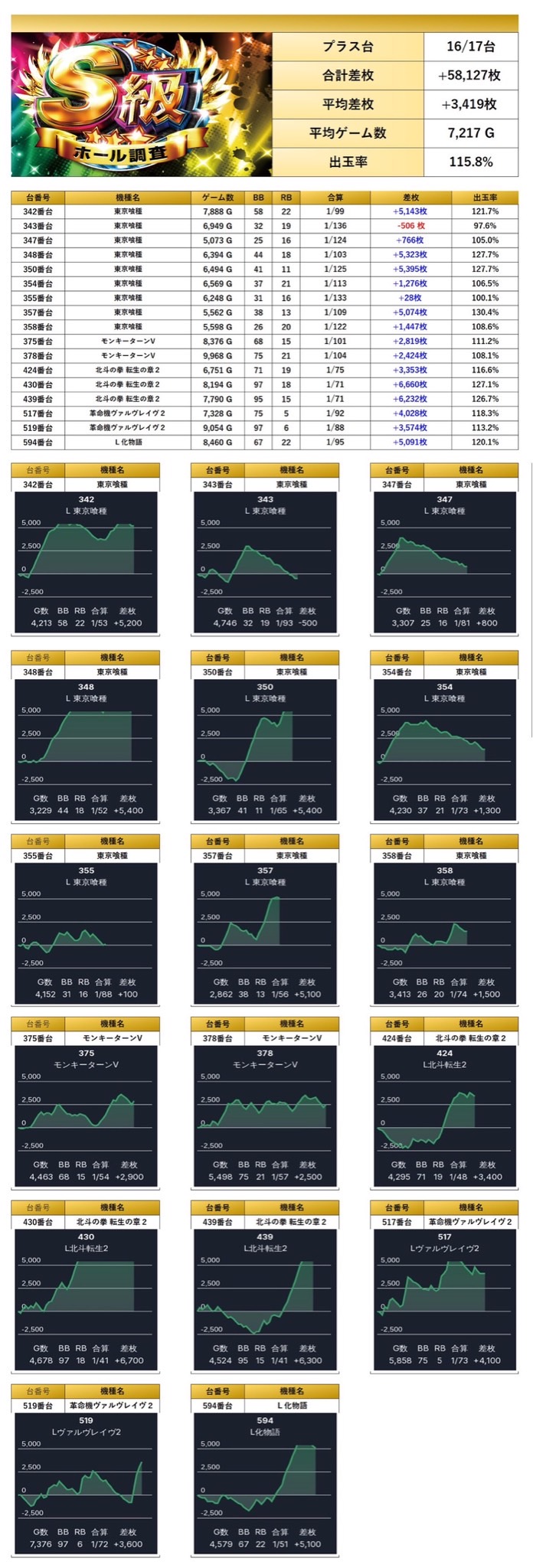 「東京喰種」「ヴヴヴ2」「モンキー」「化物語」「北斗の拳転生の章2」の5機種から17台の優秀台をpick upする。平均差枚は+3,419枚で平均出率が115.8%と114%を超える圧巻出率と勝率の高さが光った。