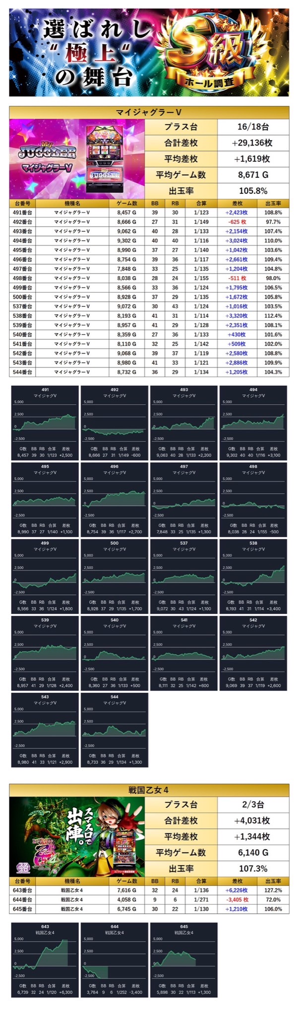 2機種21台の平均差枚は+1,579枚で平均出率が105.9%と多台数が対象となり、勝率も高く素晴らしい仕掛けになっていた。