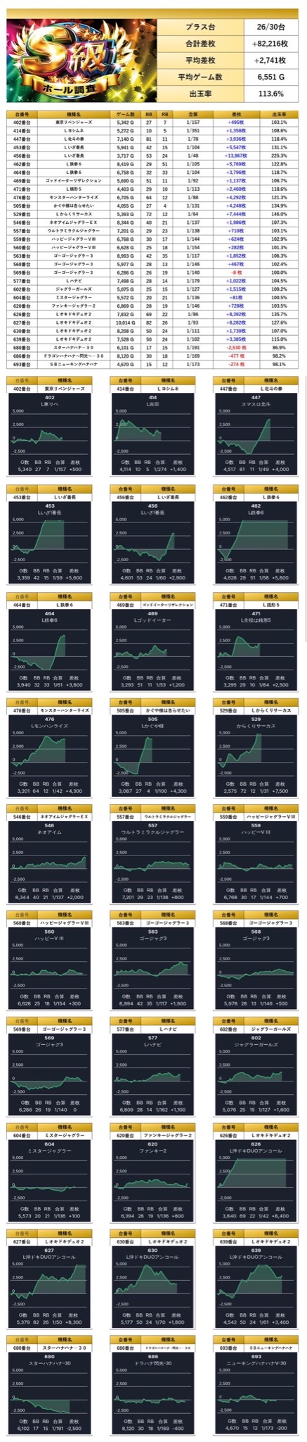 4台以上設置機種から優秀台を探すと30台をpick upすることができた。30台の平均差枚は+2,741枚で平均出率が113.6%と多彩な機種が対象になっていた。