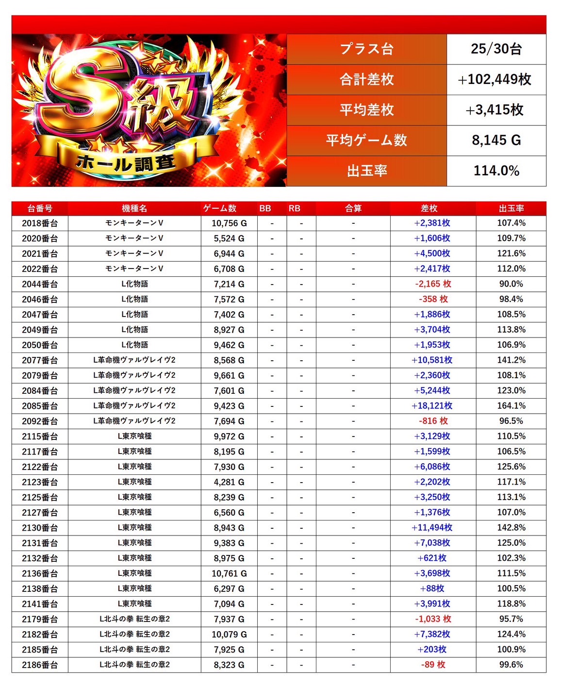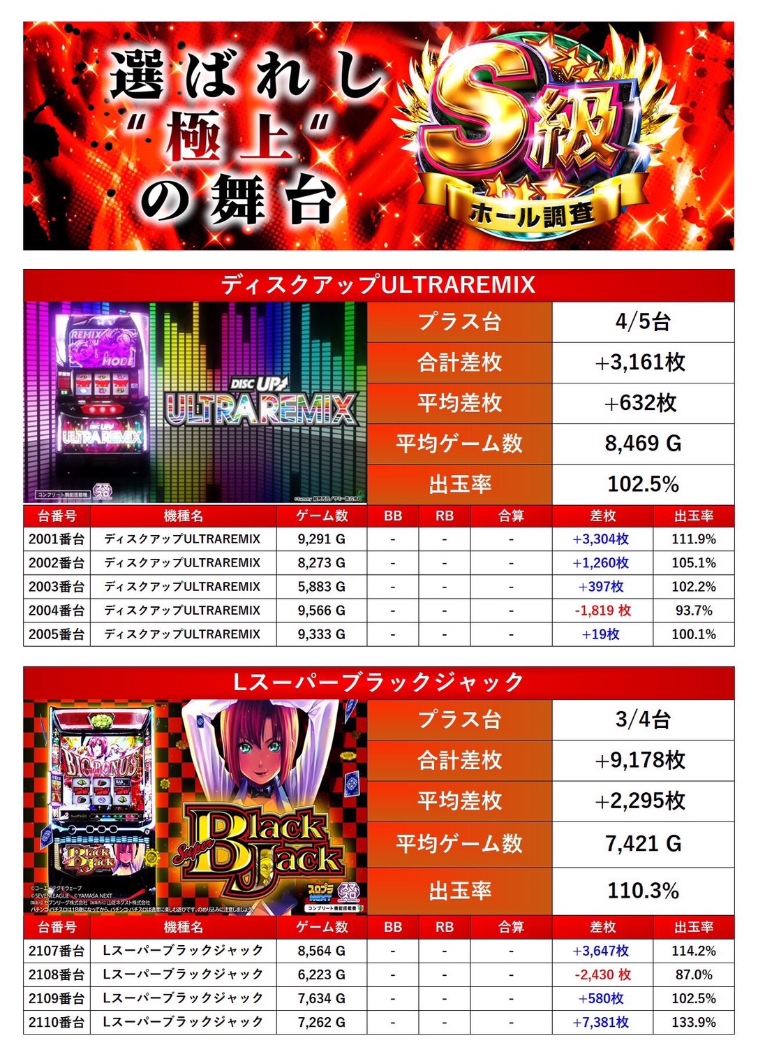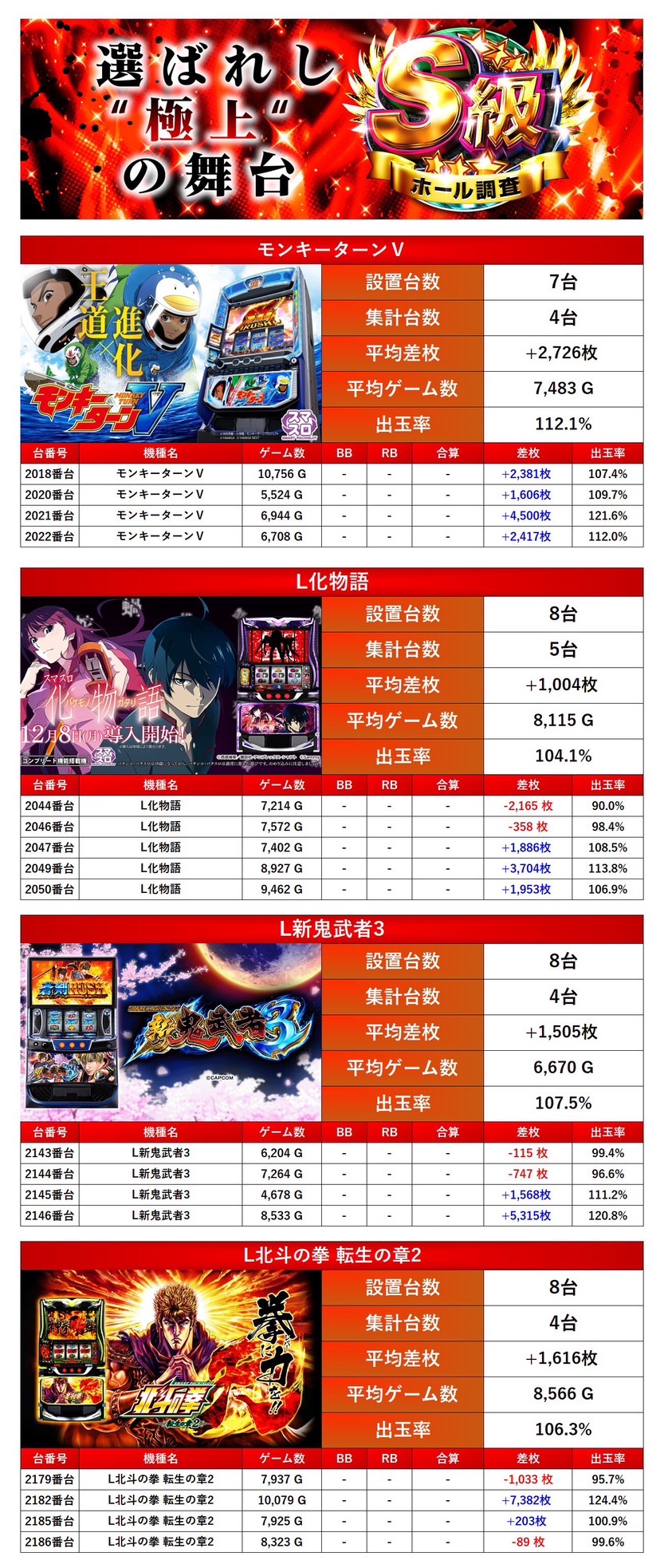 初開催となるS級‐赤‐は店内全体でpick up率は23.4%にも及び、驚愕の仕掛け量で抽選が何番でもチャンスがある数値だ。メイン機種を軸に114%を超える圧巻出率を誇った。全台系では2機種がpick upとなり、ニブイチ機種ではメイン機種が3機種も対象になっており、狙いやすい仕掛けになっていた。2台設置機種・単品と特定の機種だけでなく幅広い範囲でチャンスもありノーマル機もしっかりpick upされていた。特にジャグラーの扱いが良さそうだ。全体的みてもユーザーも遊戯を楽しめる環境となっていた。全体的に出率は安定し、今回の調査では二つ星評価となった。次回も引き続き期待している。