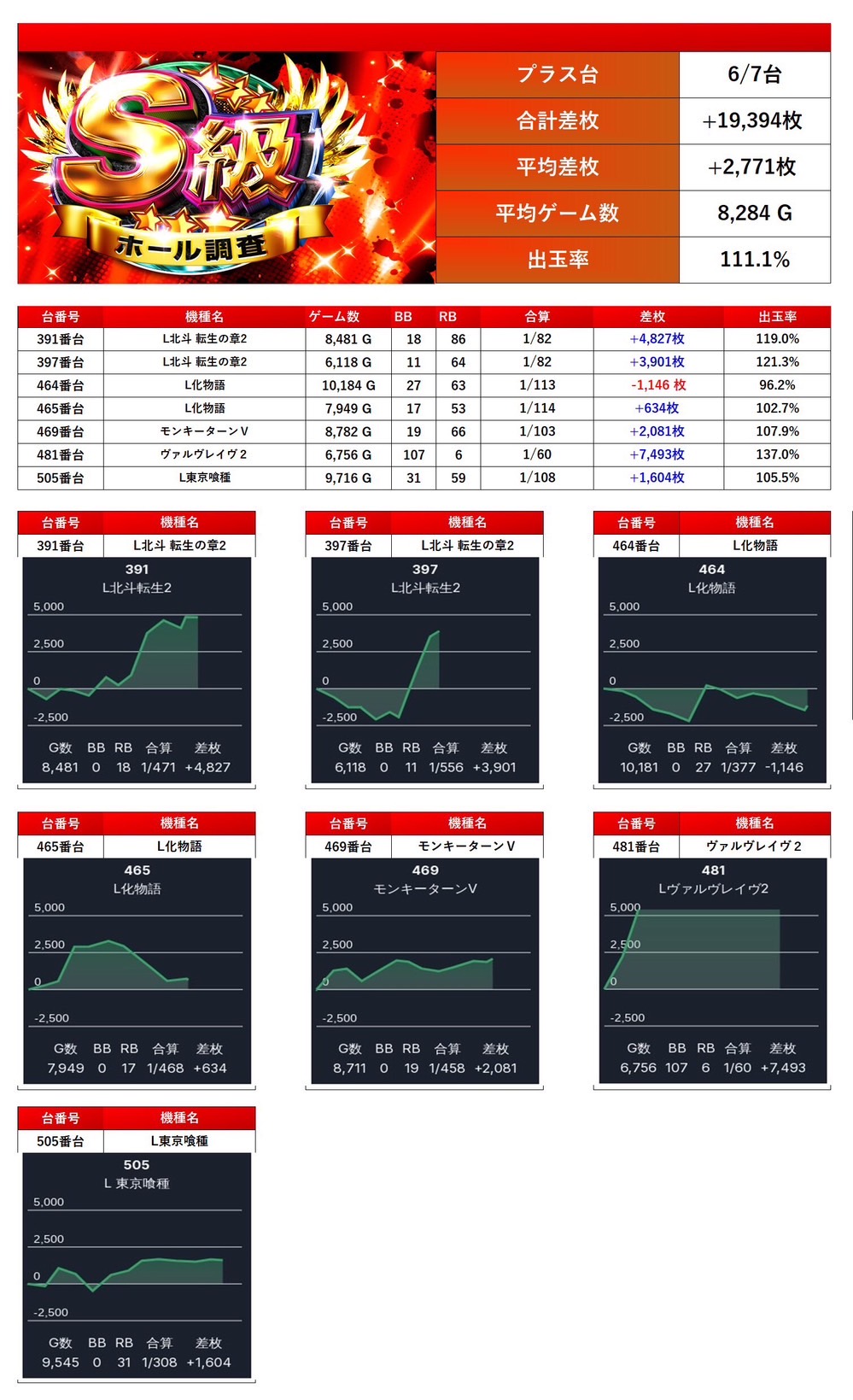 平均差枚は+2,771枚で平均出率が111.1%とメイン機種らしい安定した出率を誇った。