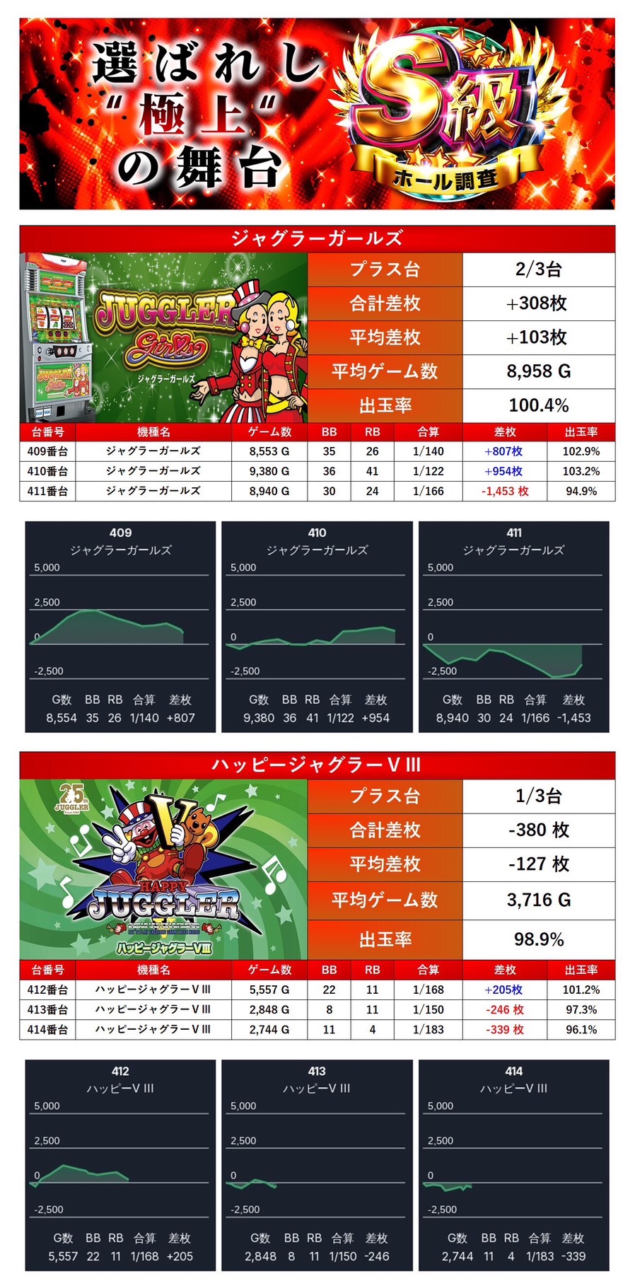 「ジャグラーガールズ」「ハッピージャグラー」の2機種をpick upする。2機種6台の平均差枚は−12枚で平均出率が99.9%となっていた。