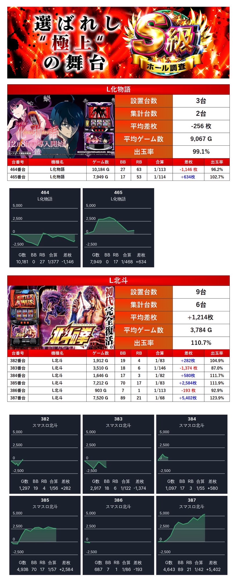 「L化物語」「L北斗の拳」の2機種をpick upする。2機種8台の平均差枚+846枚で平均出率が105.5%と打ち込みがやや足りずポテンシャルを発揮しきれていないように感じた。
