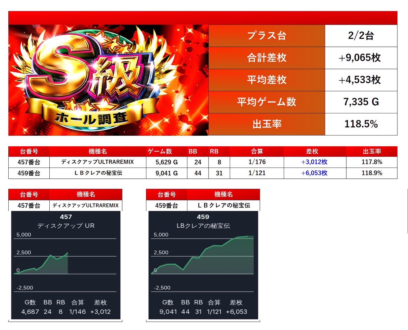 対象から2台をpick upする。2台の平均差枚は+4,533枚で平均出率が118.5%と少数台ながら際立っていた。