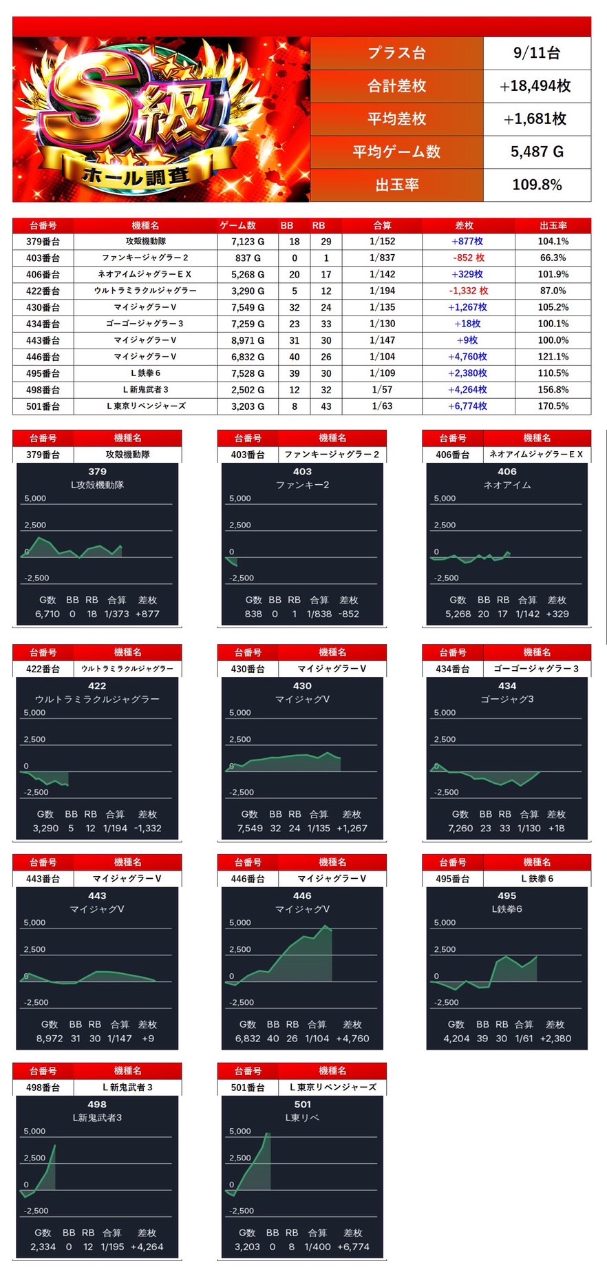 全体から11台をpick upする。平均差枚は+1,681枚で平均出率が109.8%とスマスロ、メダル機から優秀台が発見された。