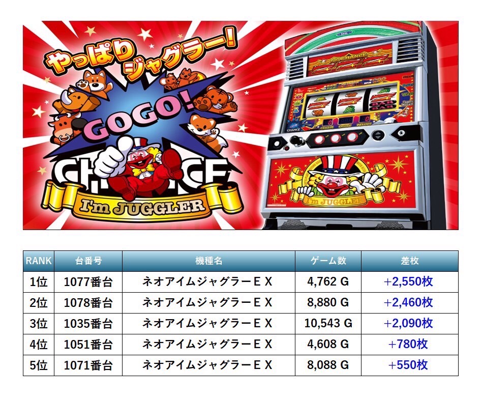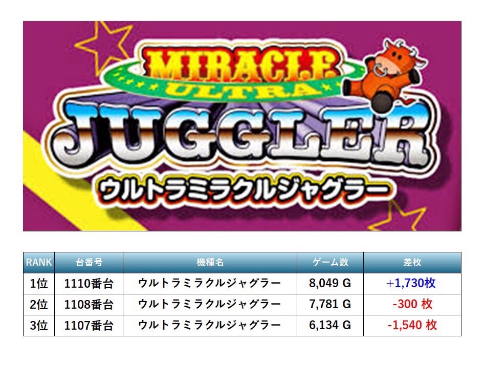 25回目となったSMART SLOTTER来店取材では3機種の多彩な仕掛けが用意された。pick up機種は「マイジャグV」「ネオアイムジャグラー」「ウルトラミラクルジャグラー」「ジャグラーガールズ」としっかりpick up機種はほとんどの台がしっかり打ち込まれていた。過去の傾向通り安定した仕掛け量と質で出玉もよかった。
