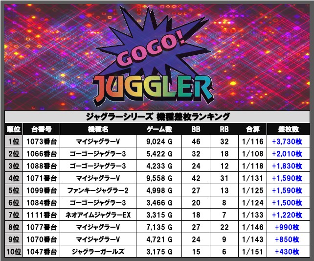 ジャグラーシリーズ差枚数ランキング👑