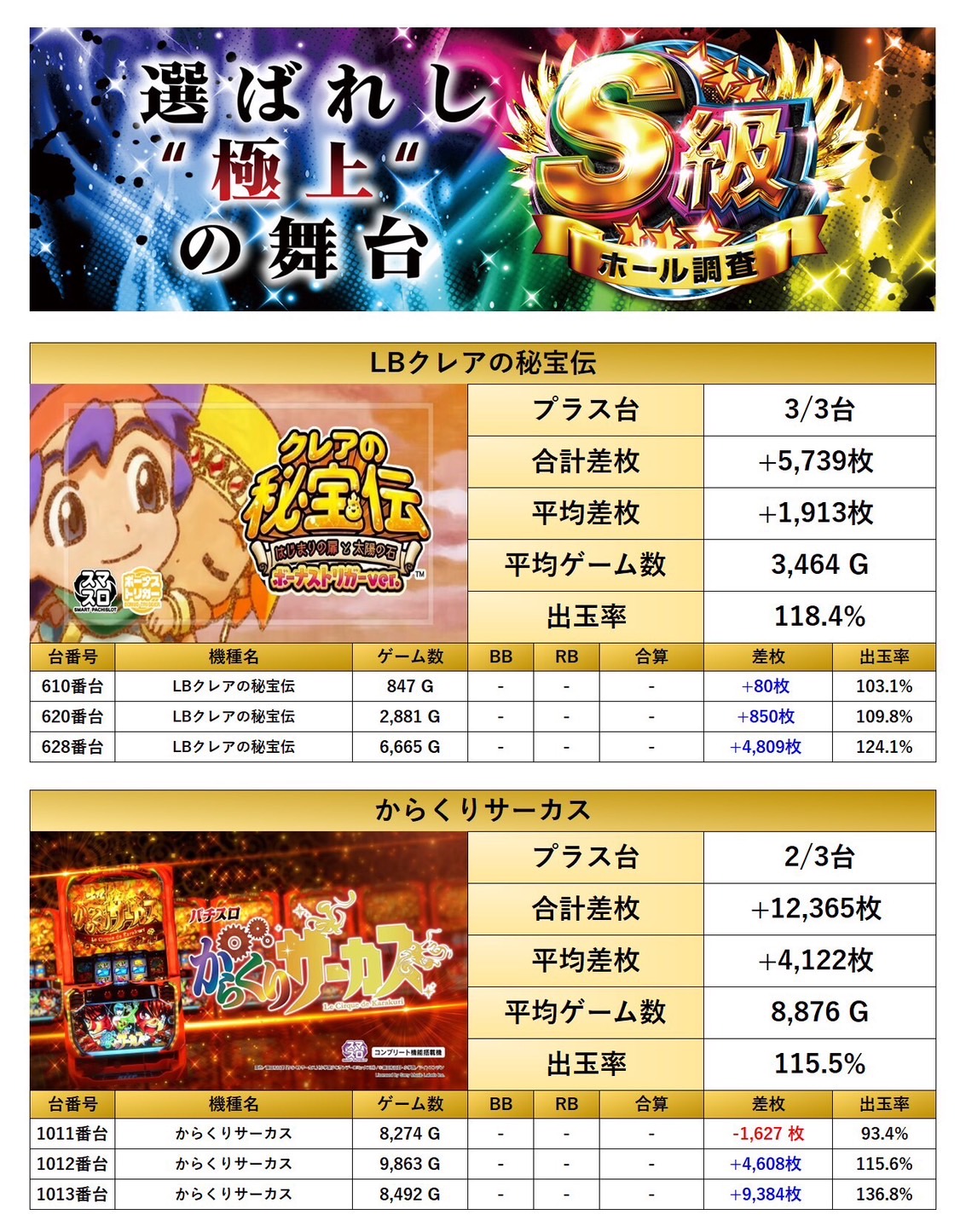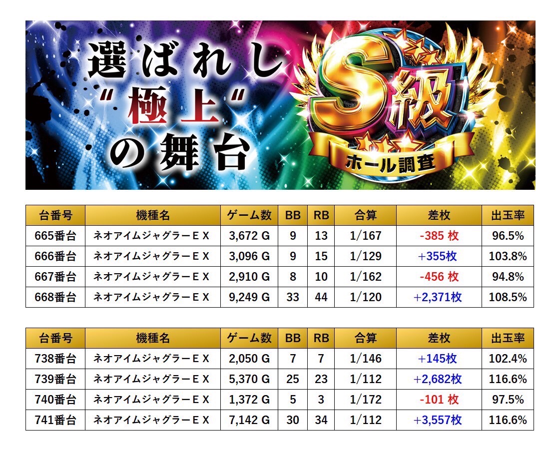 9回目となったS級虹は抽選88名/一般38名が集まってくれた。pick up率は10.0%と限定的な仕掛けとなり、集計された機種の平均出率は106.5%と心許ない結果となった。総差枚数+10,560枚/平均+22枚という数値で事実上は横ばいであり、評価材料としてはやや控えめ。構成意図は見えたものの結果が伴わなかった。「メイン機からの仕掛け」では下振れしてしまい出率は控えめ。「設置の全台が好調な機種」では2機種pick upと116.3%と出率も圧巻で素晴らしかった。「並び仕掛け」ではジャグラーから2箇所が対象と「4台以上機種」では27台が対象になり、人気のスマスロからメダル機までがしっかりフォローされていた印象だった。今回は総じて全館総差枚が分岐に届かず、二つ星評価となった。仕掛け量を増やすことで評価が一段階上がる可能性を感じる。次回は期待している。