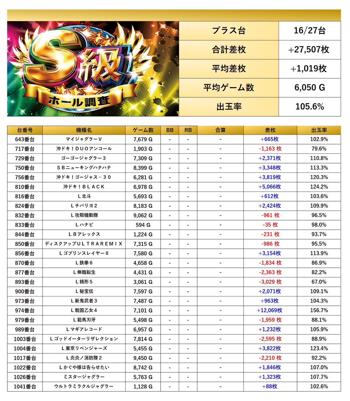 平均差枚+1,019、平均出率105.6%となった。多彩な機種が対象になっていた。