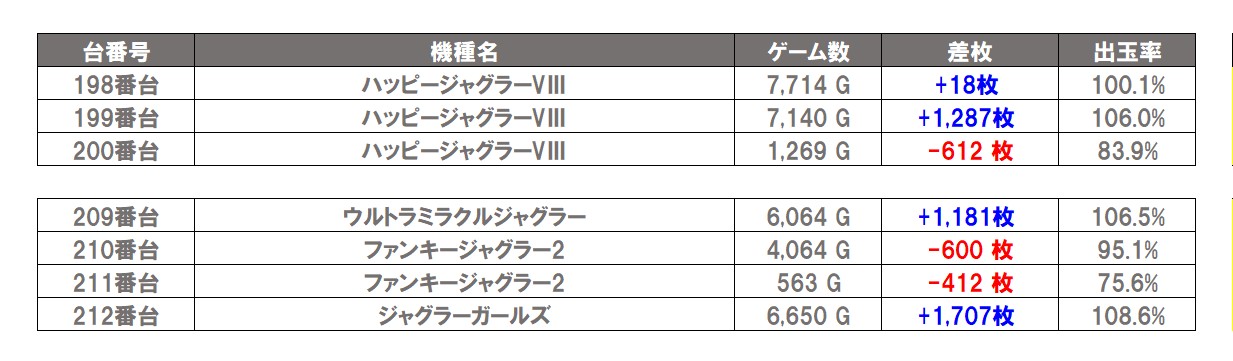 3台並びを1箇所、4台並びを1箇所の計2箇所見つけることができた。2箇所の平均差枚は+1,780枚で平均出率が115.3%だった。