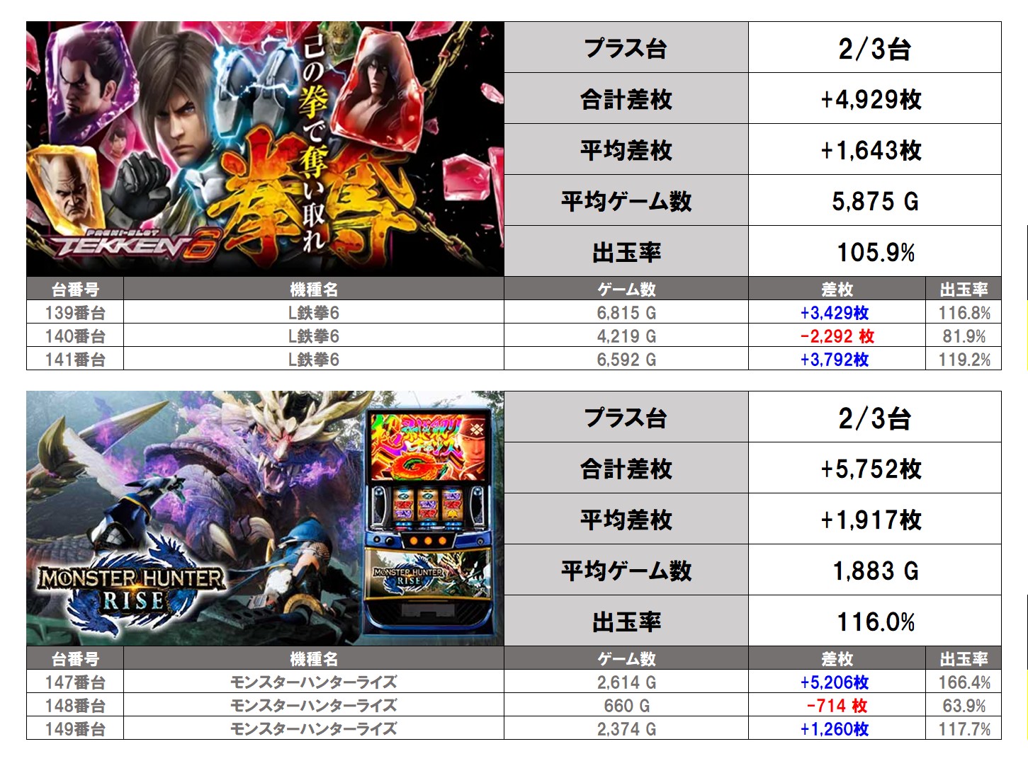 対象になった機種は「鉄拳6」「モンハンライズ」の2機種となった。平均差枚は+367枚で平均出率が102.6%だった。