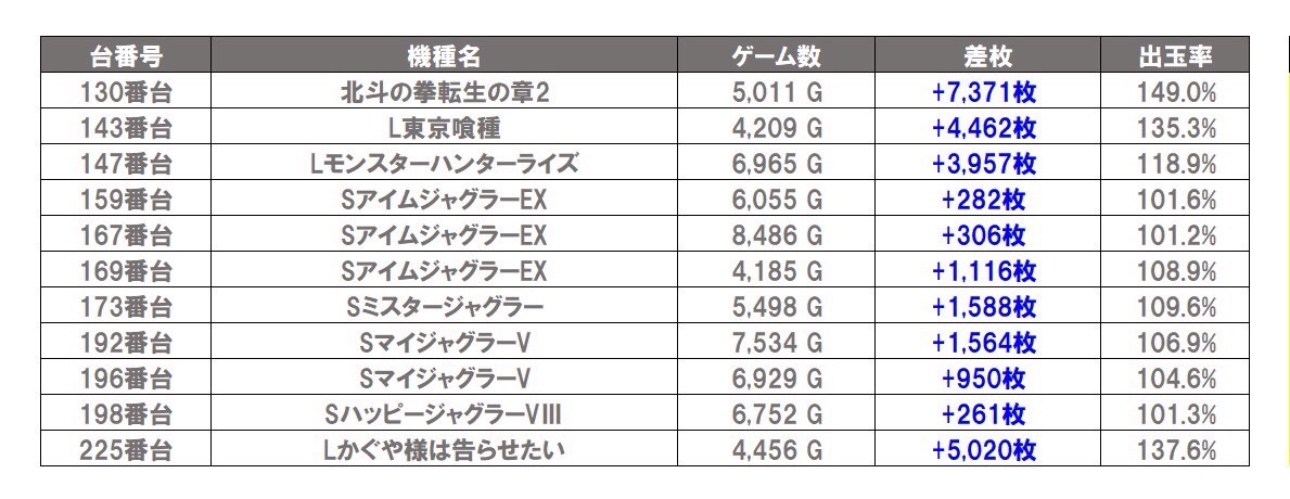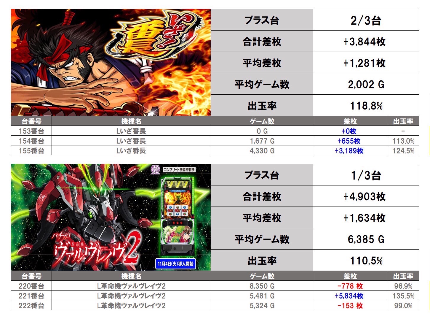 対象になった機種は「いざ!番長」「ヴァルヴレイヴ2」の2機種となった。平均差枚は+1,458枚で平均出率が111.6%だった。
