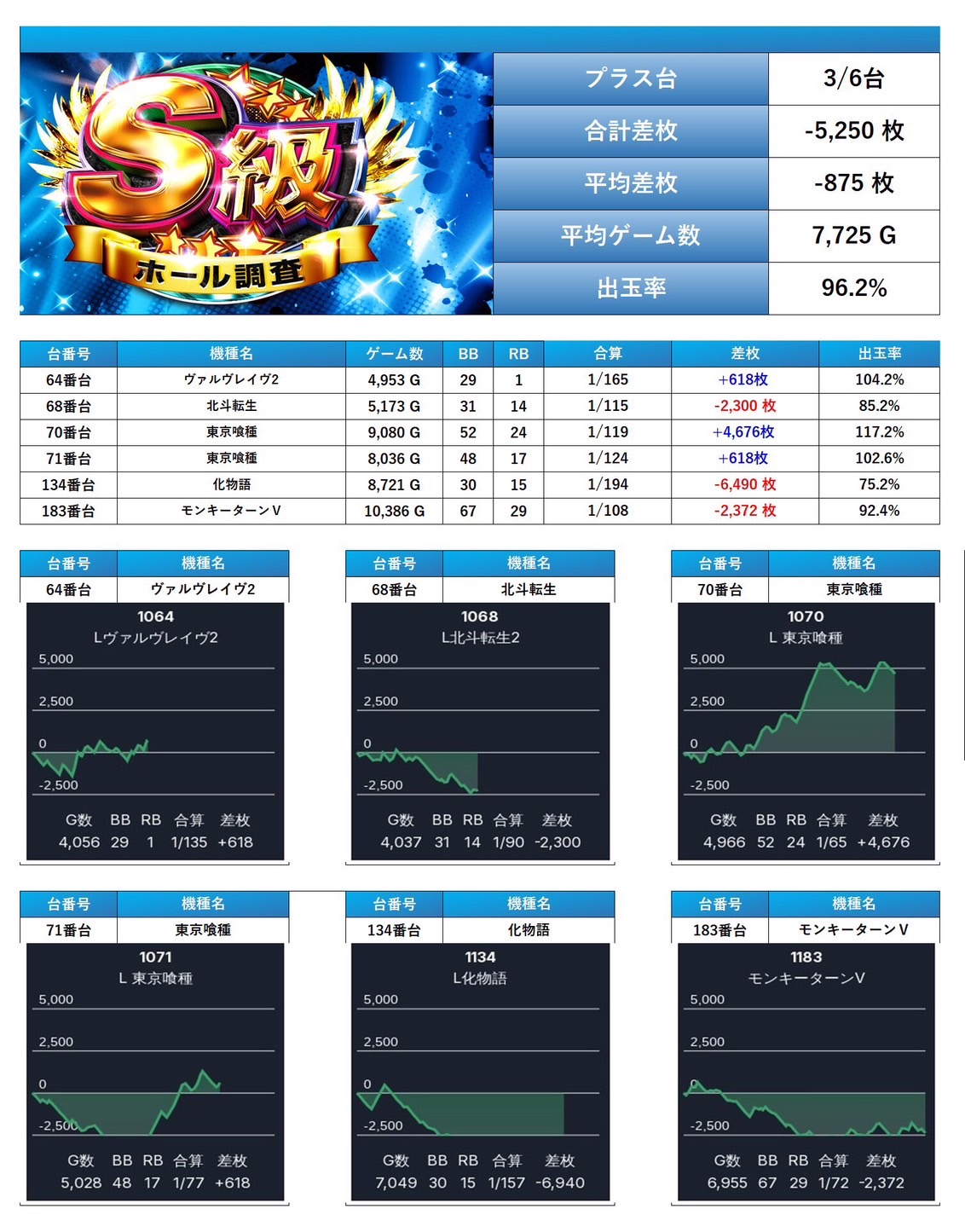主力の人気機種から5機種6台の優秀台が出現。平均差枚−875枚、出率96.2%としっかり打ち込まれてはいるものの、伸ばし切れずマイナスに終わった。