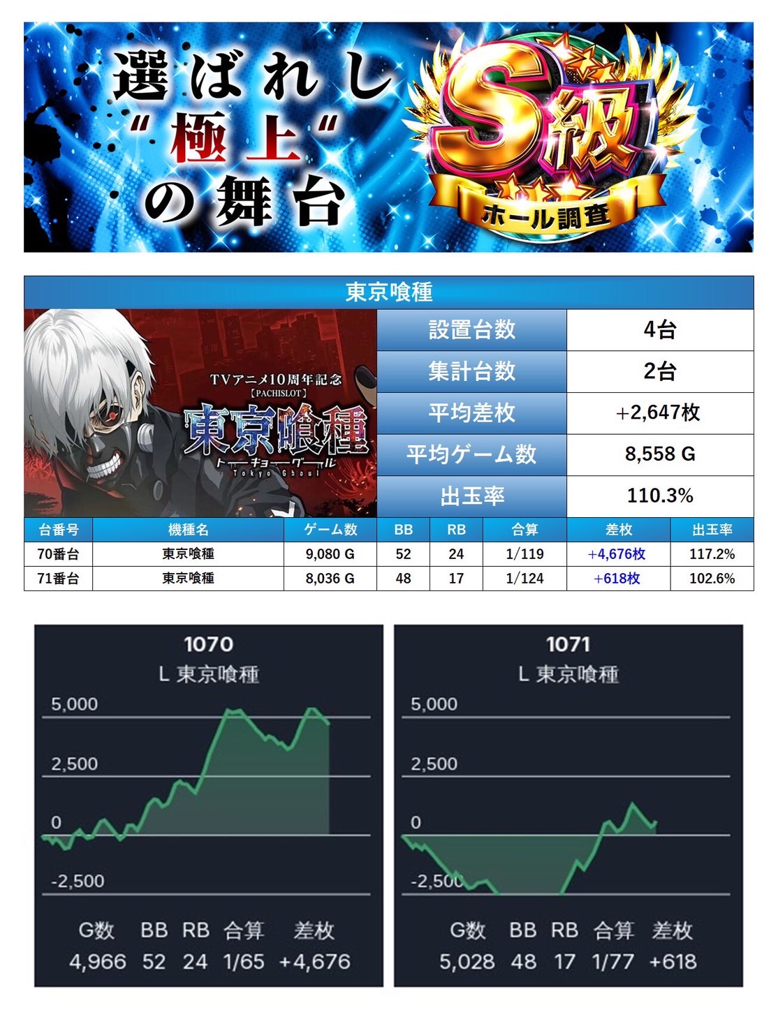 メイン機種からは「東京喰種」の1機種2台がpick upされた。平均差枚+2,647枚、出率は110.3%と設置の2/4であり、良番を引いたら狙いたい機種だ。