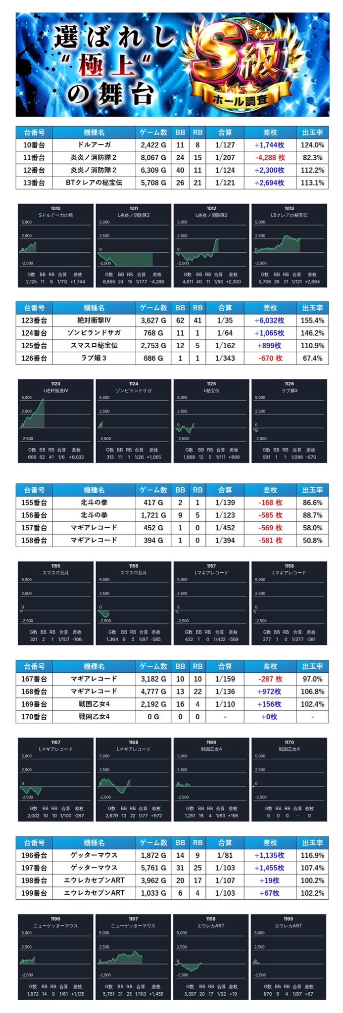 メイン機種では展開に恵まれずマイナス域での着地となったが、ニブイチで対象になった東京喰種では110%を超える安定した出率を確保し、並び仕掛けでは機種跨ぎで多彩な仕掛けが用意されていた。
