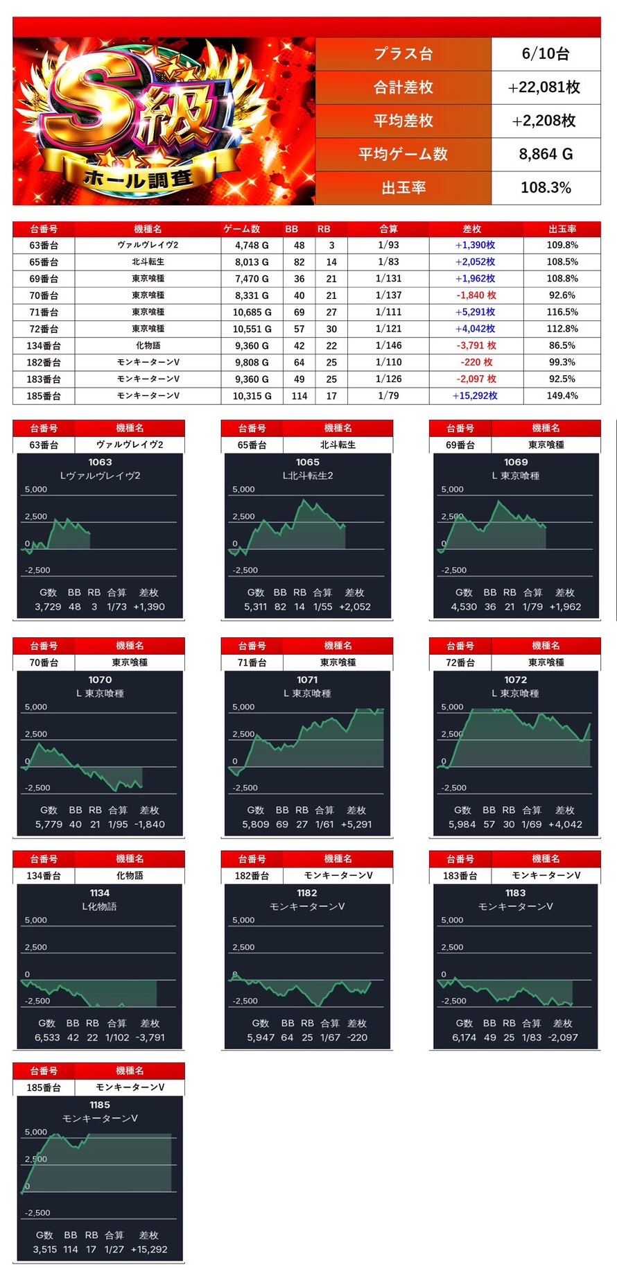 平均差枚は+2,208枚、出率108.3%を記録し、安定した出玉感を演出した。