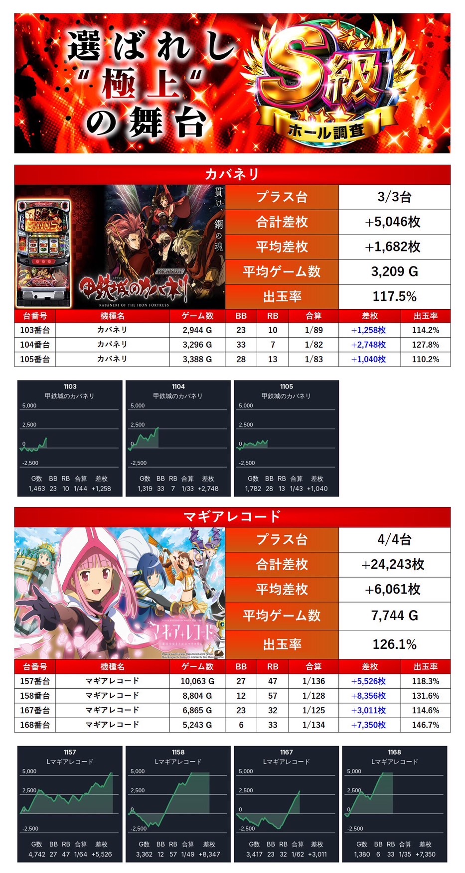平均差枚は+1,755枚、出率109.3%と随所で少数機種ながらもしっかり打ち込まれ勝率の高さが光った。