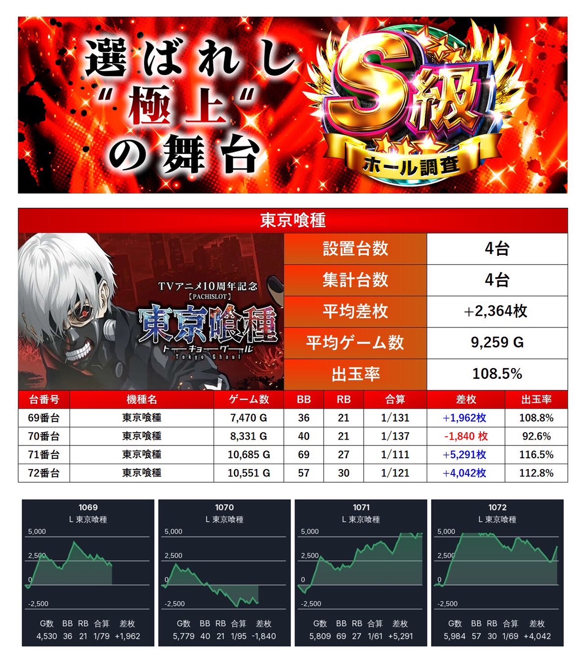「設置の半分が優秀だった」機種ではメイン機種から「東京喰種」の1機種4台をピックアップ。