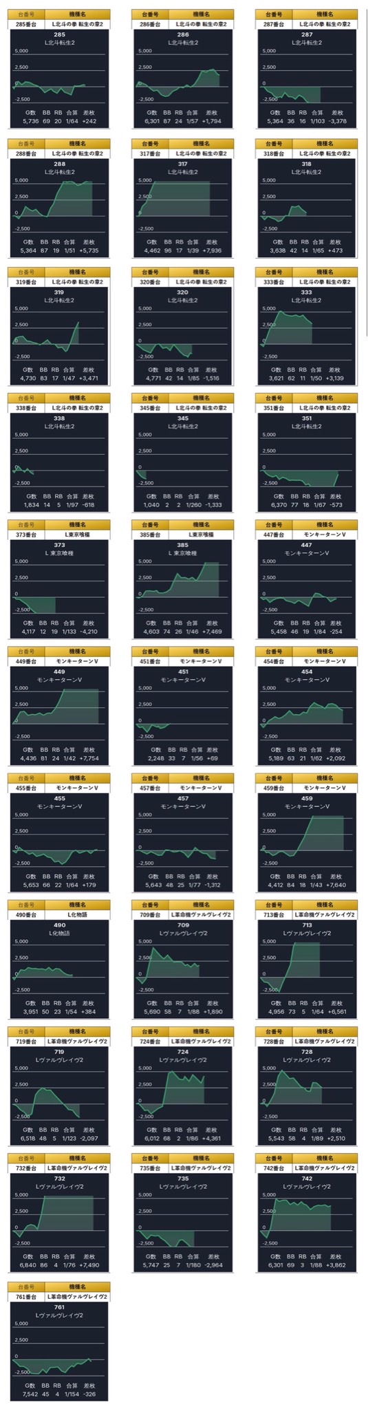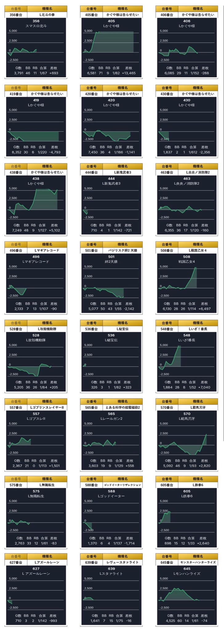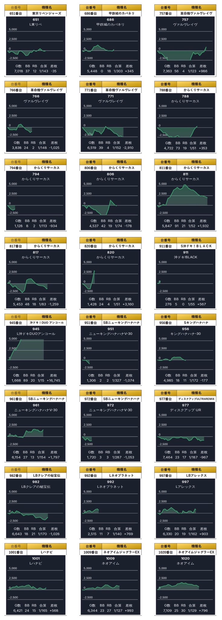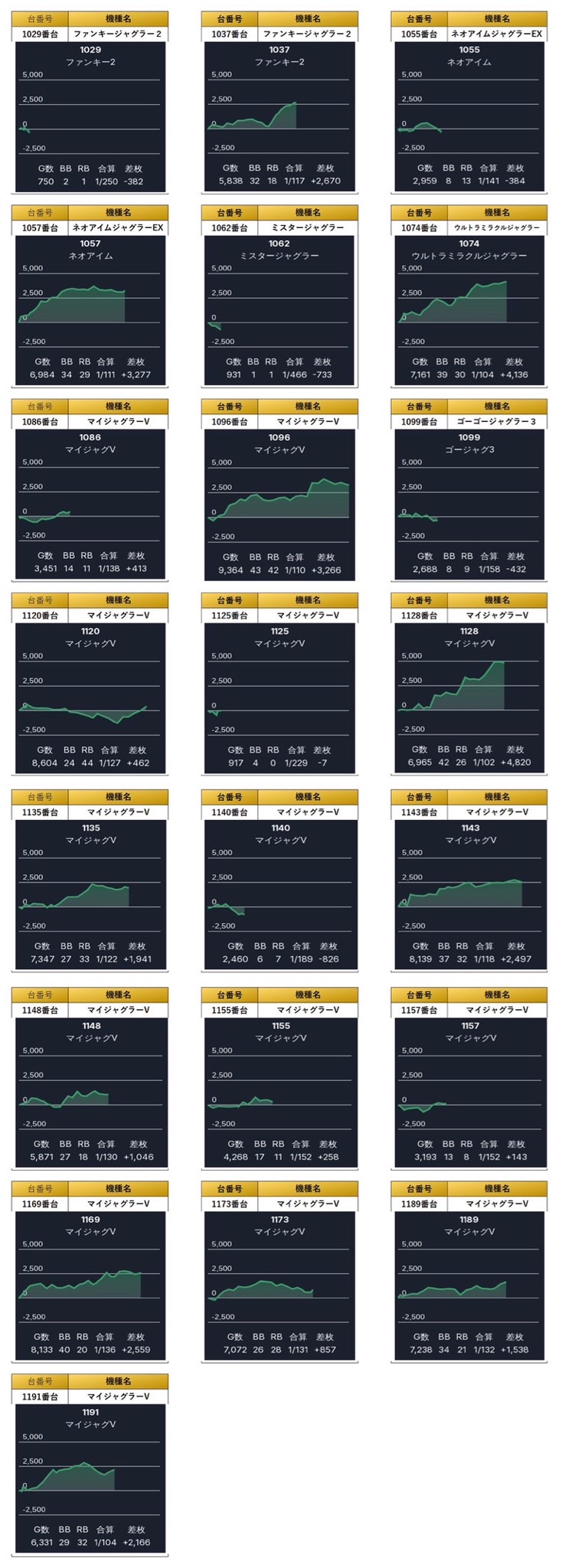4台並びを計4台をpick upする。4箇所16台の平均差枚は+3,383枚で平均出率が123.6%と朝から好挙動台のラインを早い段階で掴む立ち回りが有効的だった。