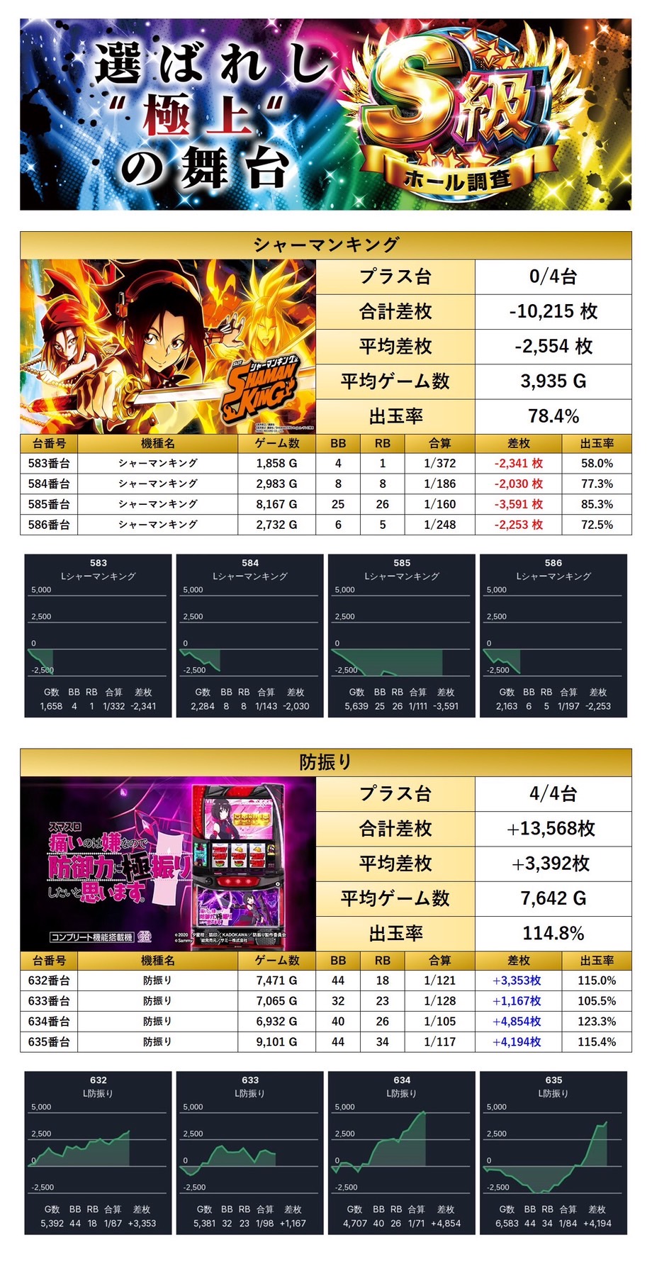 「シャーマンキング」「防振り」の2機種をpick upする。2機種8台の平均差枚は+419枚で平均出率が109.3%だった。