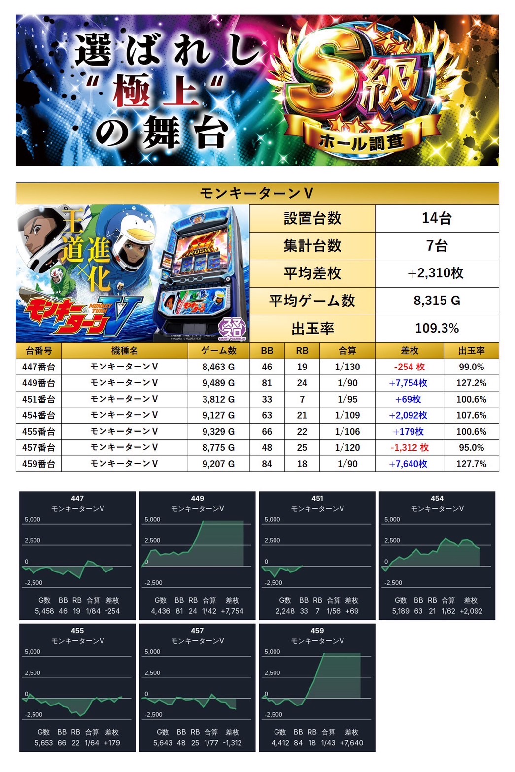 優秀台でも紹介した「モンキーターン」の1機種をpick upする。1機種7台の平均差枚は+2,310枚で平均出率が109.3%としっかりプラス域を確保していた。