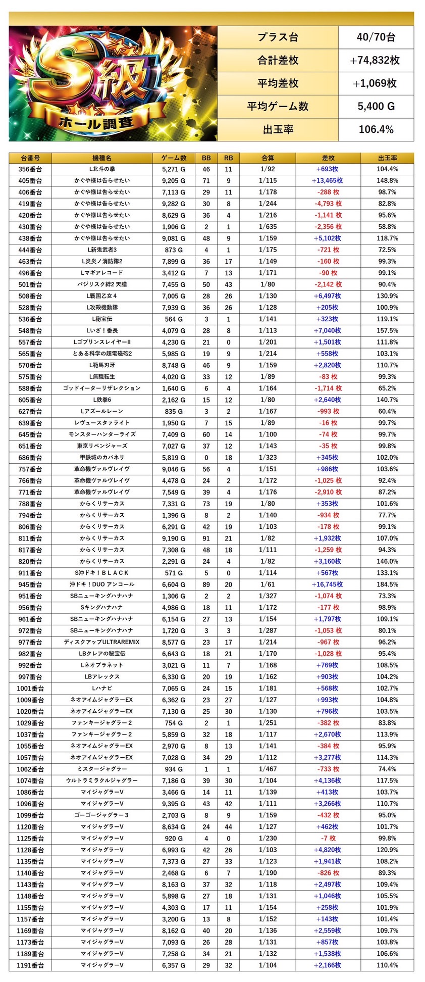 4台以上設置機種から優秀台を探すと70台をpick upする事ができた。70台の平均差枚は+1,069枚で平均出率が106.4%と多彩な機種が対象になっていた。