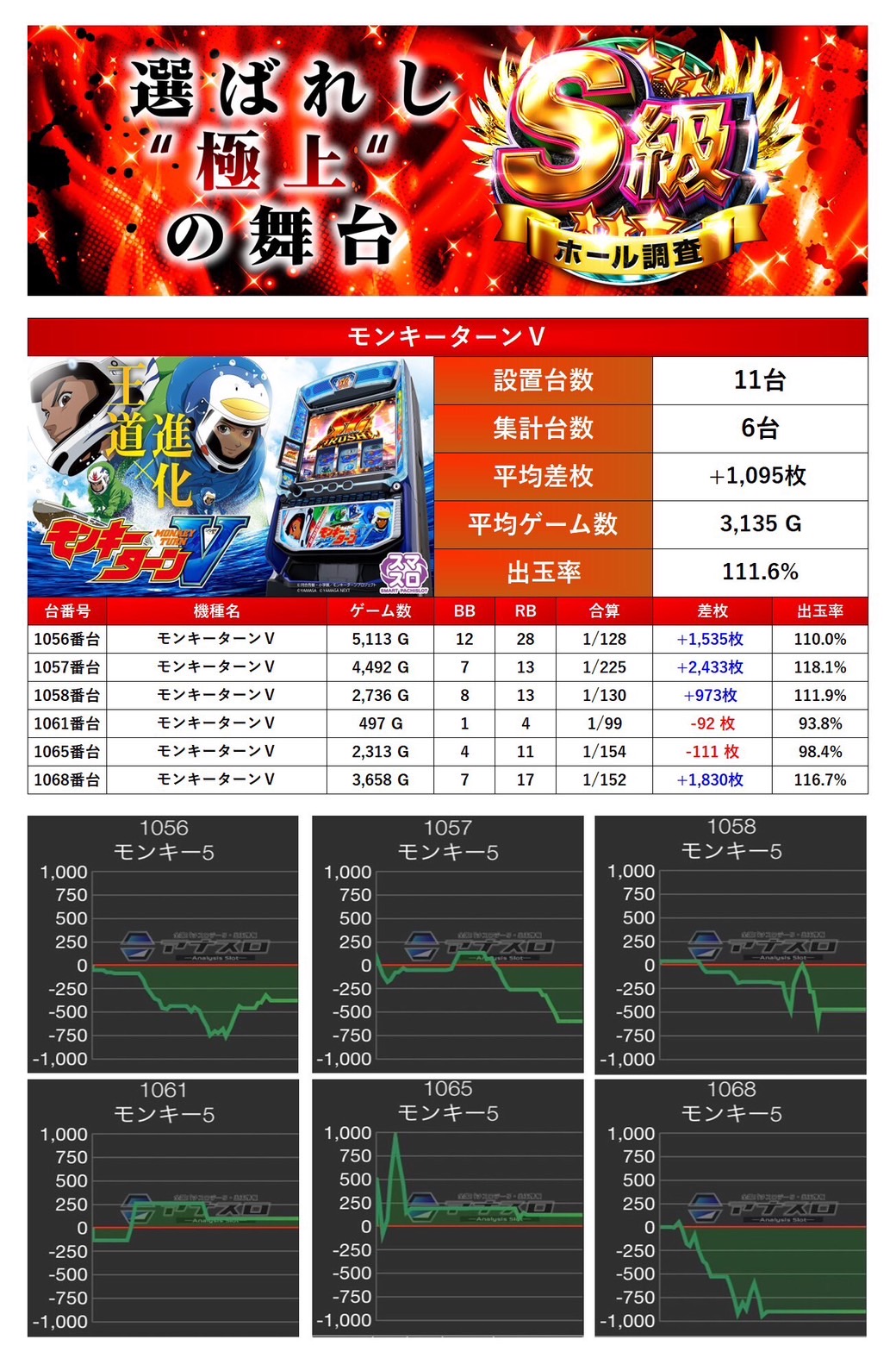 平均差枚+1,095枚、出率111.6%と出率は十分だったが、回転数が少ない台もありまだまだ伸びしろがありそうだ。