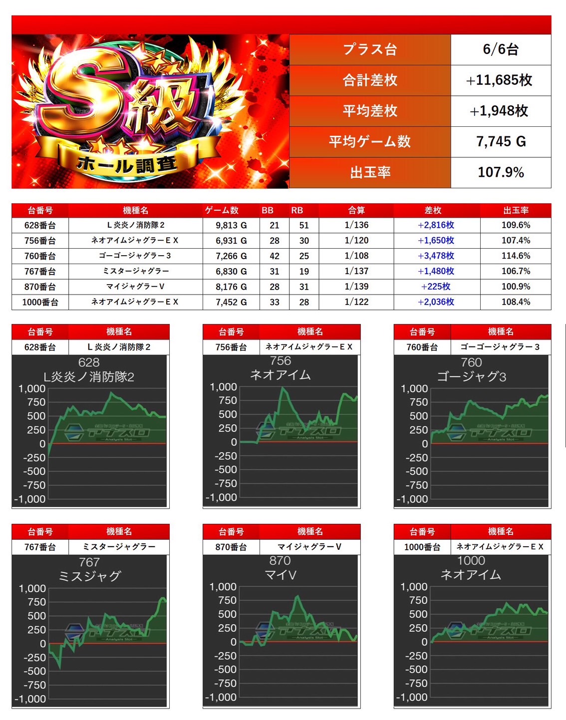 単品で投入された6台は平均差枚+1,948枚、出率107.9%と優秀な結果を記録。次回以降もこの単品投入は見逃せない。