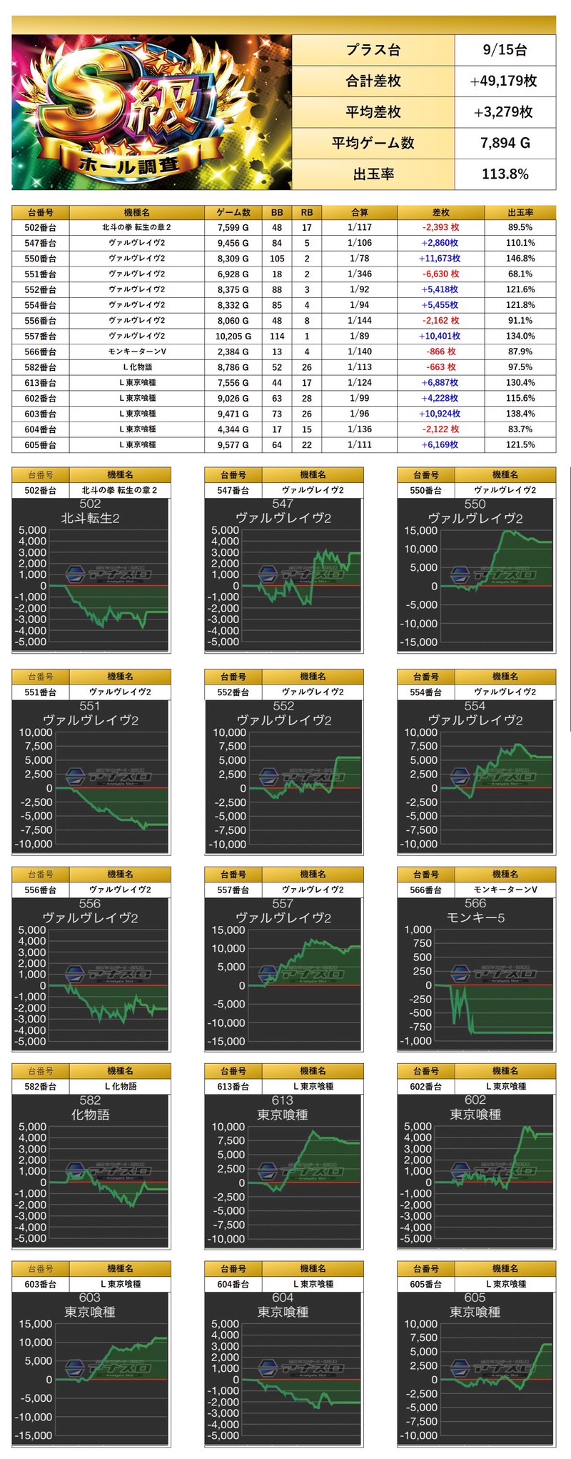 今回が初の開催となったS級調査-虹-は抽選220名/一般80名と沢山のユーザーが足を運んでくれた。店内全体のpick up率12.5%となっていた。局所的に仕掛けられ強弱がはっきりしていて狙いを掴めたユーザーは確信を得て打ち込むことが出来ただろう。総差枚は+129,792枚/平均+338枚と圧巻の差枚数で三つ星評価獲得となった。